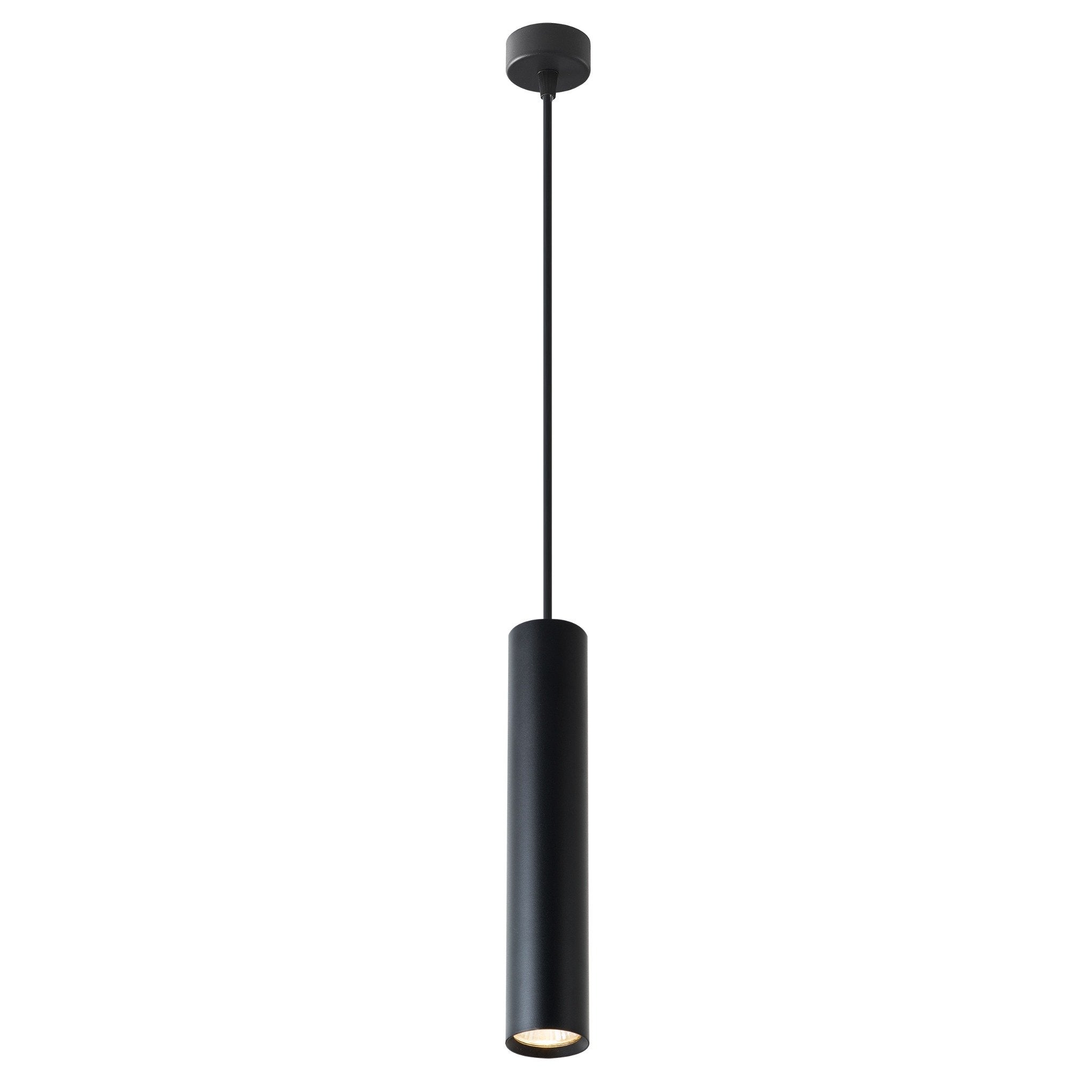 Smukła tubowa forma o średnicy 5,4 cm i wysokości 29 cm nadaje jej subtelny i designerski charakter. Czarna matowa obudowa z aluminium i stali podkreśla nowoczesny styl, a dzięki regulowanemu przewodowi o długości do 1 m lampa może być idealnie dopasowana do aranżacji wnętrza – zarówno w pojedynkę, jak i w zestawie kilku opraw ustawionych w linii lub grupie. Oprawa została zaprojektowana do współpracy z jedną żarówką LED GU10 o mocy do 35W (brak w zestawie). Takie rozwiązanie pozwala uzyskać skupione, punktowe światło idealne do podświetlania stołu, blatu kuchennego, baru, obrazów czy innych elementów dekoracyjnych.