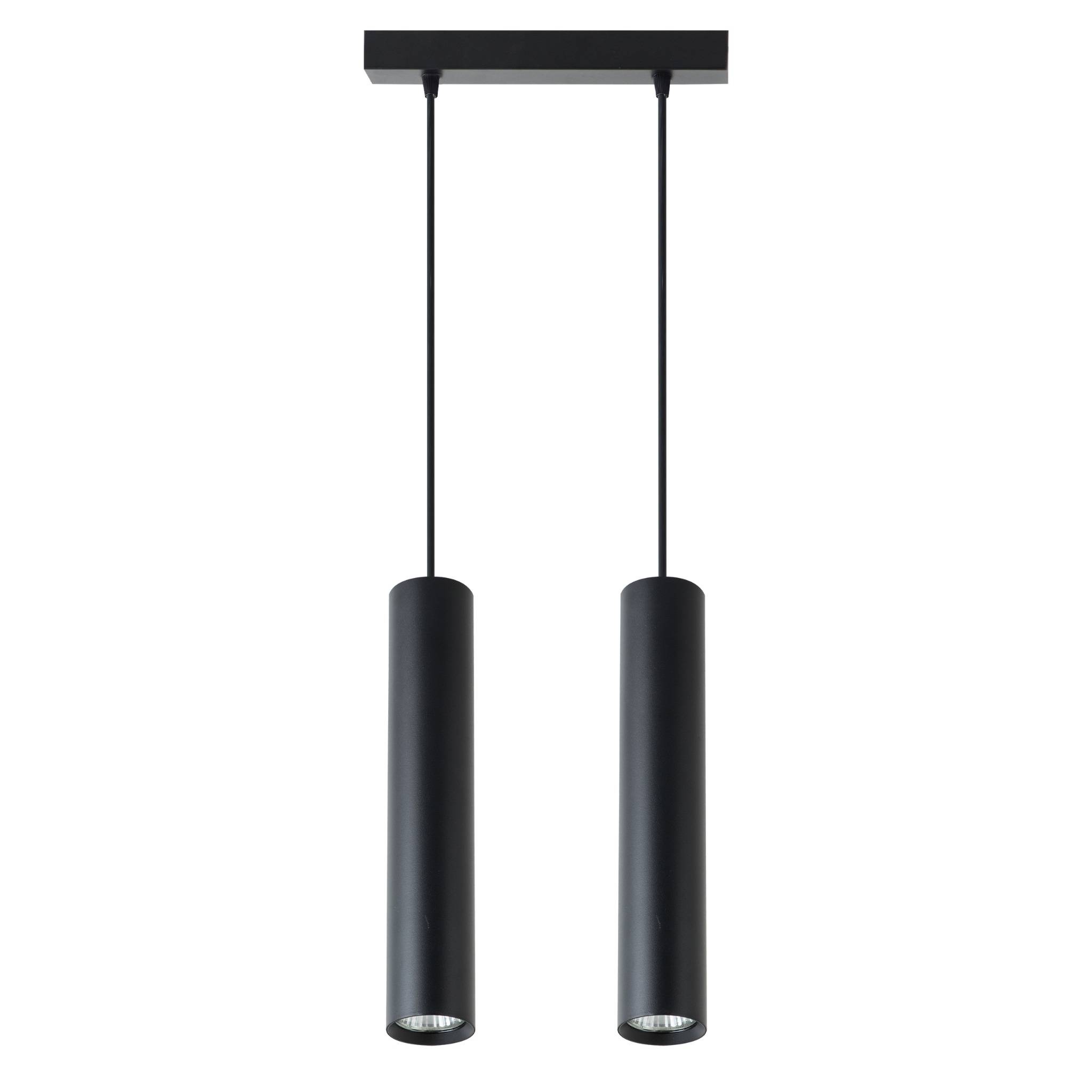 Smukłe tubowe oprawy o średnicy 5,4 cm i wysokości 29 cm nadają wnętrzu nowoczesny charakter, a ich rozmieszczenie na prostokątnej podstawie 22 cm zapewnia harmonijny rozkład światła. Czarna matowa powierzchnia lampy podkreśla minimalistyczny design, który świetnie komponuje się z aranżacjami loftowymi, industrialnymi czy skandynawskimi. Oświetlenie typu zwis to rozwiązanie idealne nad wyspą kuchenną, stołem w jadalni czy jako oświetlenie korytarza. Oprawa jest przystosowana do dwóch żarówek LED GU10 o maksymalnej mocy 35W każda (brak w zestawie). Tego typu źródło światła daje skupiony strumień, który znakomicie sprawdza się do podkreślania elementów wnętrza lub tworzenia nastrojowego klimatu.