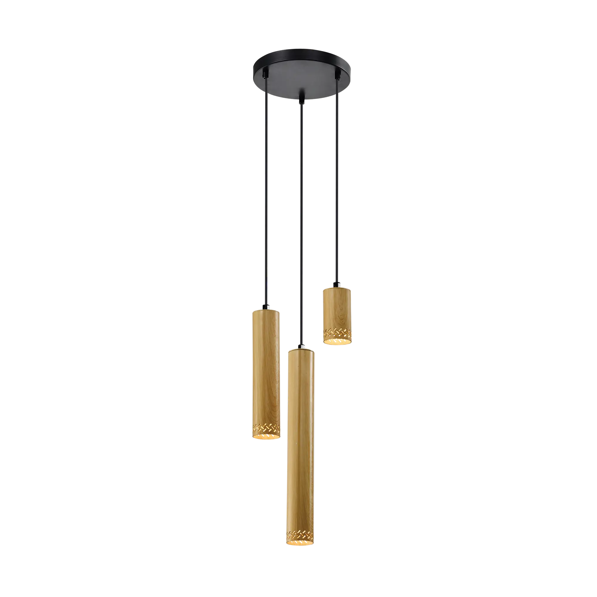 Lampa wisząca Tubo podstawa okrągła o szerokości 22cm wykonana z metalu w kolorze czarnym ,czarne linki na których zawieszone są trzy klosze o różnych wymiarach największy wysokość 40cm, 25cm oraz klosz 10cm wykonane z metalu w kolorze drewnianym. Wyposażona trzonek GU10 do wymiennych źródeł światła. Dodatkową zaletą lampy sufitowej jest możliwość regulacji wysokości poprzez wciągniecie kabla i umieszczeniu go w podstawie lampy lub skrócenie kabla. Lampa Tubo to styl nowoczesny polecana do salonu, sypialni, kuchni.