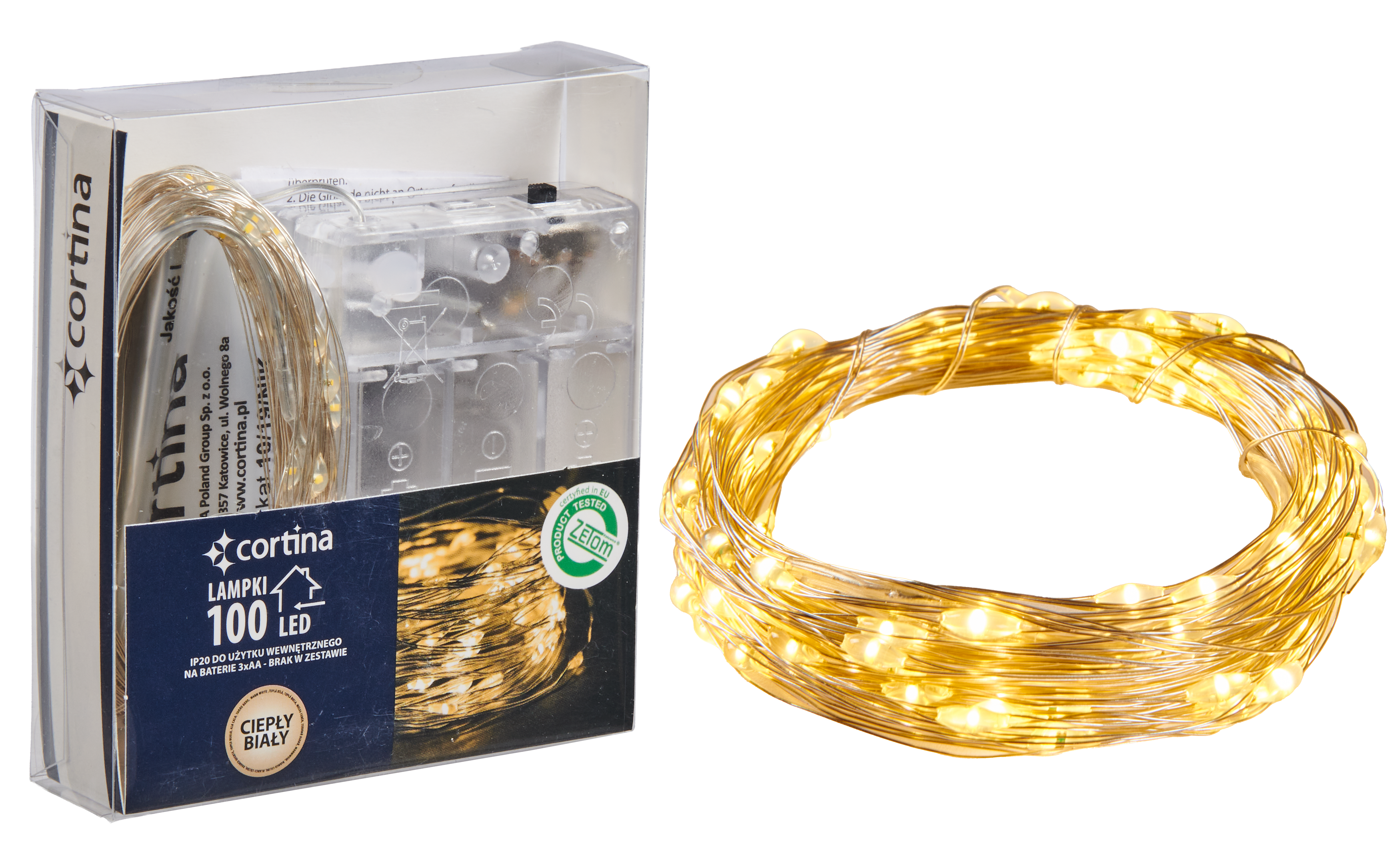 Lampki choinkowe wewnętrzne 100 MICRO LED łezki na baterie ciepłe białe Cortina