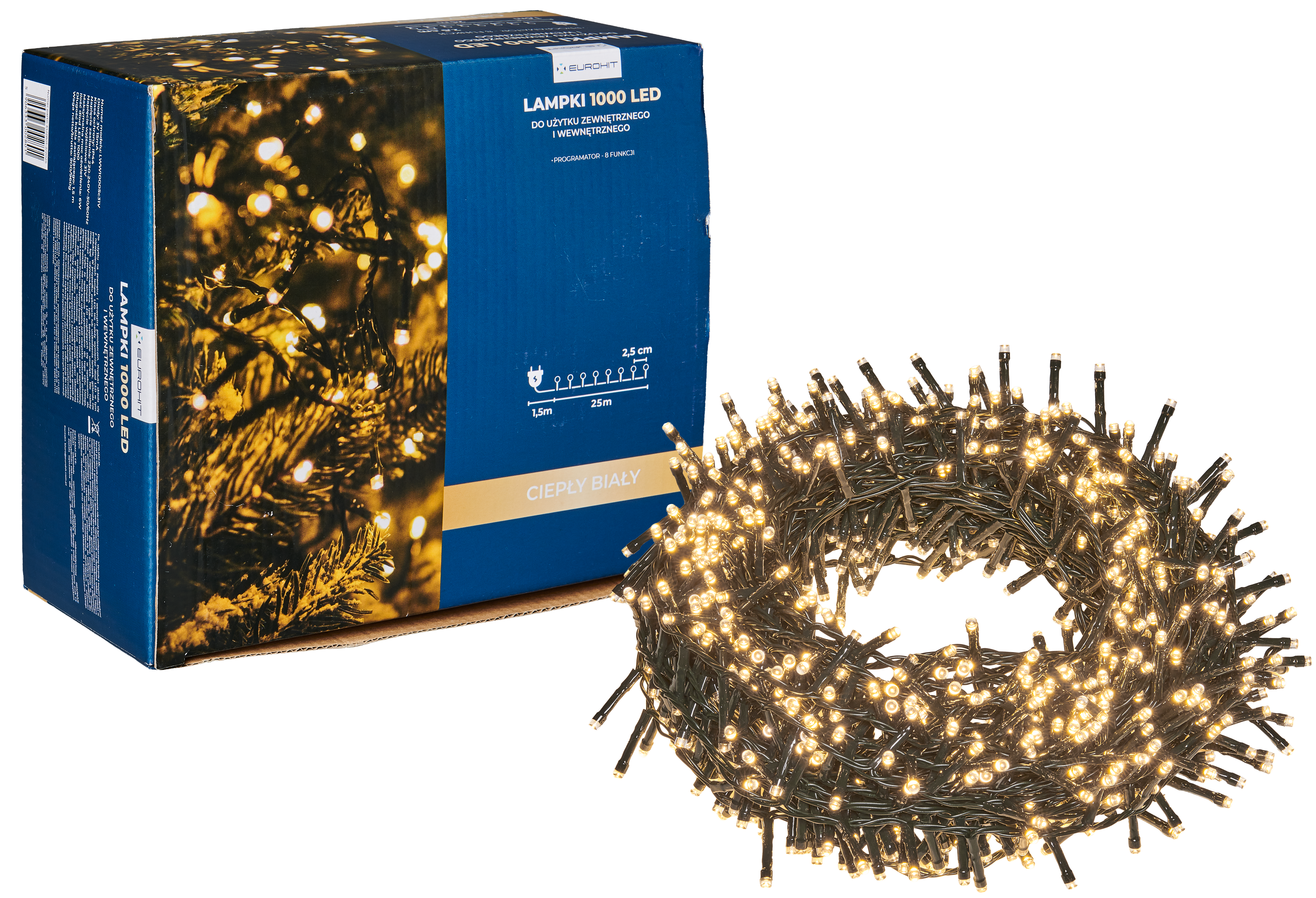 Lampki choinkowe zewnętrzne 1000 LED 8 funkcji, programator, ciepły biały EUROHIT
