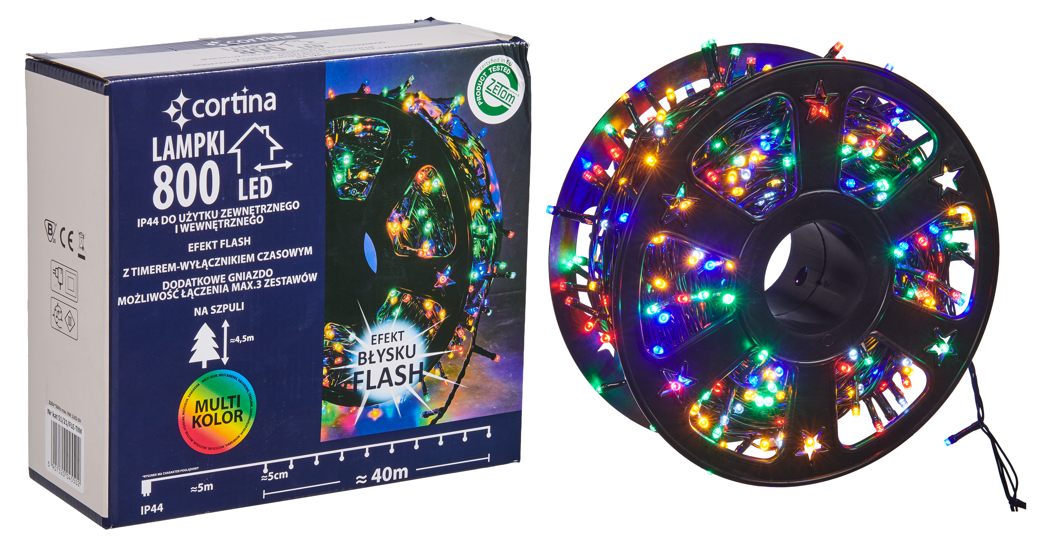Lampki 800 LED wielokolorowe z funkcją timera i efektem flash. Oświetlenie jest wyposażone w transformator, dzięki czemu może być używane wewnątrz i na zewnątrz. W zestawie figuruje również dodatkowe gniazdo, które pozwala na łączenie takich samych zestawów światełek.