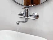 Bateria umywalkowa ścienna Elegancka bateria montowana w ścianie, idealna do nowoczesnych wnętrz, oszczędza miejsce i podkreśla minimalizm.