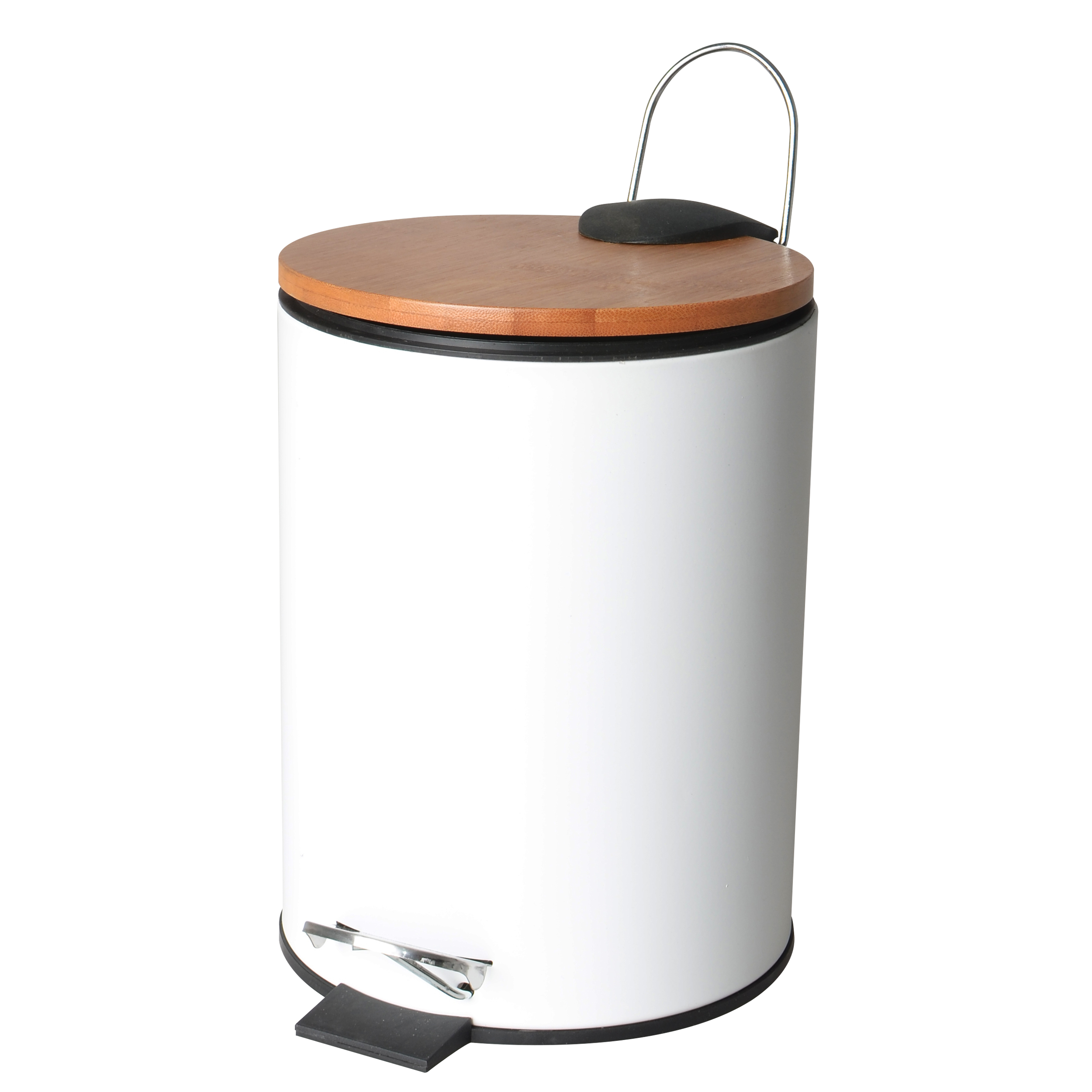 Kosz na śmieci wykonany ze stali malowanej proszkowo oraz z naturalnego drewna bambusowego. Pojemnik w kolorze białym o gładkim, matowym wykończeniu. Pokrywa zrobiona z drewna bambusowego dodaje wyjątkowego wyglądu całemu produktowi. Dzięki wygodnemu pedałowi możemy otworzyć pokrywę bez używania rąk. Wewnątrz kosza znajduje się czarny pojemnik z rączką, dzięki której łatwiej jest opróżnić kosz. Podstawa całego produktu wykonana jest z tworzywa sztucznego, które nie porysuje powierzchni podłogi. Z tyłu kosza znajduje się dodatkowy, metalowy uchwyt do przenoszenia lub zawieszenia kosza. Pojemność kosza wynosi 3 litry.