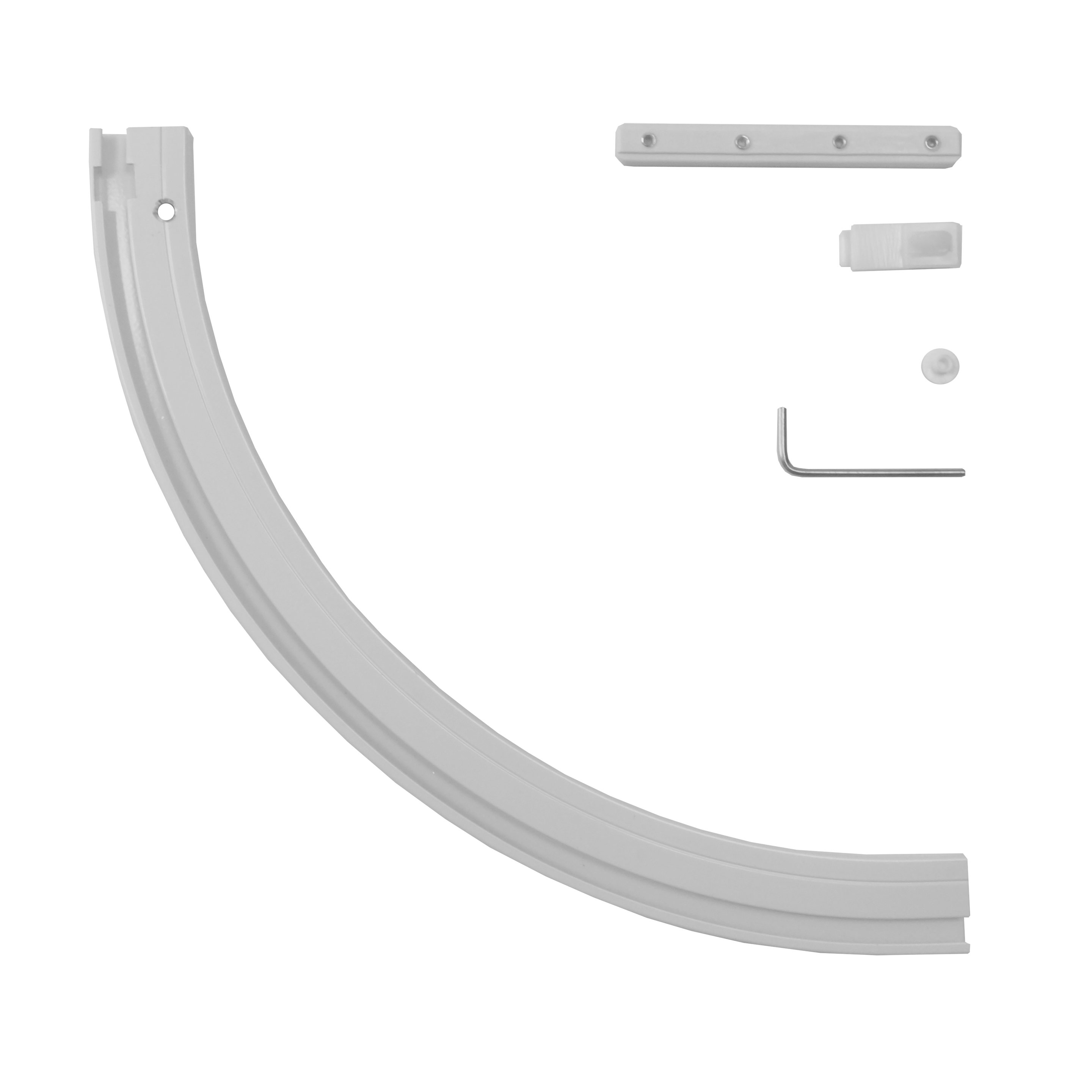Łuk do szyn aluminiowych Helsinki umożliwiający dosunięcie tkaniny do ściany pomieszczenia. Łuk prawy, jednotorowy, uniwersalny do szyn jedno, dwu i trzytorowych.