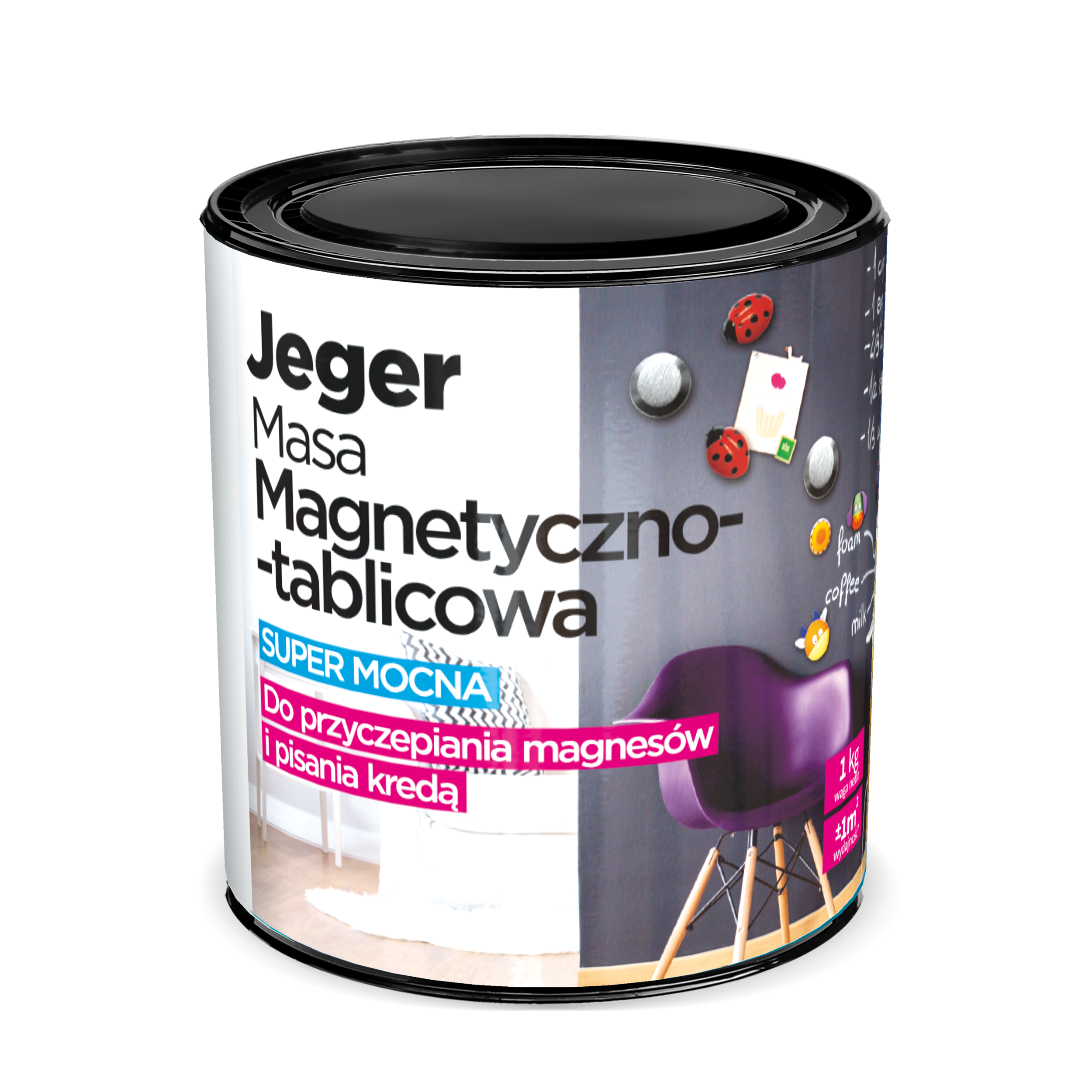 Jeger Masa magnetyczno–tablicowa to unikatowe połączenie, dzięki któremu możliwe jest stworzenie powłoki, na której można rysować kredą i przyczepiać magnesy. Ta niezwykła farba tablicowa jest idealną propozycją dla miłośników nietypowych wnętrzarskich rozwiązań. Dzięki niej zakątek każdego pokoju może szybko zmienić się w kącik kreatywnych zabaw, a każdy mebel stać prawdziwym dziełem sztuki. Jest to możliwe, ponieważ masę magnetyczno – tablicową Jeger można stosować na ścianach, drewnie oraz płytach drewnopochodnych. Warto pamiętać o odpowiednim zabezpieczeniu powłoki stworzonej z wykorzystaniem masy. Aby to zrobić należy suchą powłokę pokryć lakierem Jeger Lakier Extra Mat.
