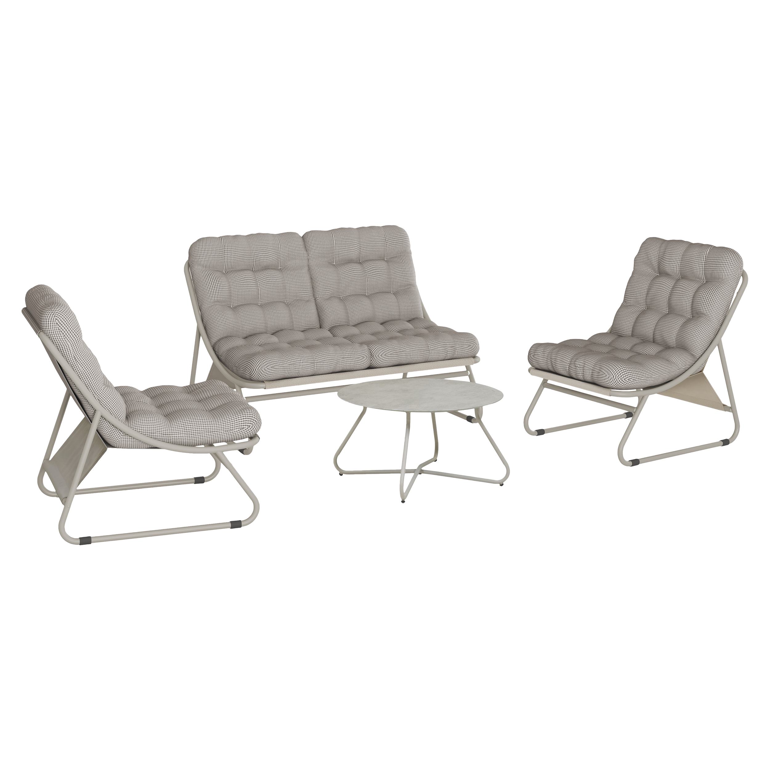 Unikalny zestaw mebli ogrodowych w nowoczesnym stylu, który idealnie sprawdzi się do aranżacji modnych stref wypoczynku na tarasie lub w ogrodzie. W komplecie znajduje się dwuosobowa sofa, dwa fotele i kompaktowy stolik kawowy. Optymalnie wyprofilowane siedziska z systemem oxford i z poduszkami umożliwiają komfortowy wypoczynek w ulubionej pozycji. Rama mebli wykonana została ze stali, co przekłada się na ich trwałość i dłuższy czas użytkowania. Miękkie poduchy ze spun poliestru świetnie sprawdzą się w użytkowaniu zewnętrznym dzięki wyższej odporności na wilgoć. Zestaw mebli ogrodowych wyposażony jest w stolik kawowy z blatem ze szkła hartowanego, które wyróżnia się wyższą odpornością na zarysowania i jest łatwe w utrzymaniu w czystości. Całość to wygodny i funkcjonalny komplet, który doskonale sprawdzi się podczas wspólnych spotkań