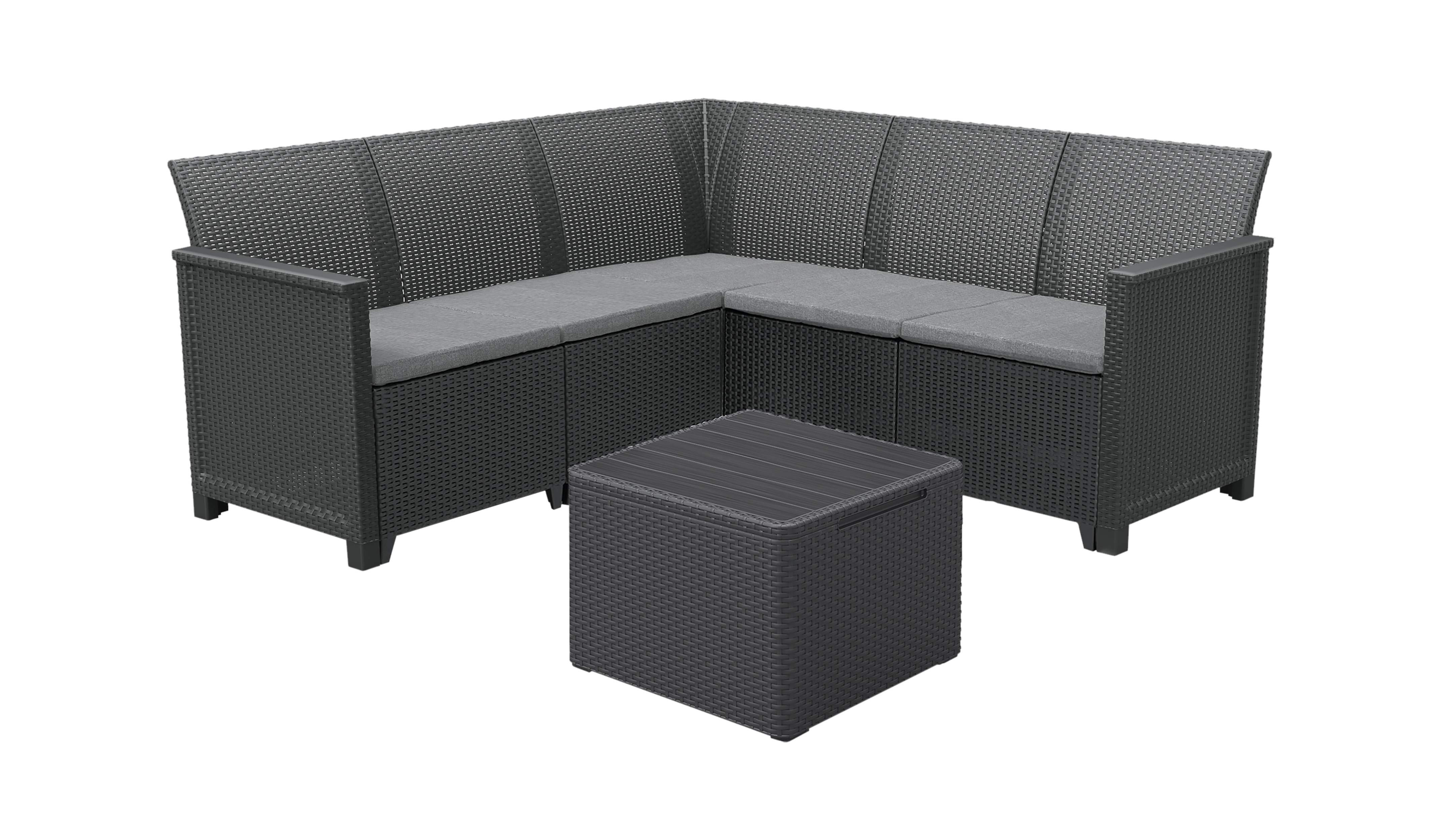 Meble ogrodowe zestaw Elodie antracytowe Keter to zestaw wykonany z największą precyzją. Składa się z wygodnej 5 osobowej, narożnej sofy oraz stylowego kawowego stolika, które zapewniają najwyższy komfort użytkowania. Meble o lekkiej, ale stabilnej konstrukcji są wykonane z wysokiej jakości materiału odpornego na niekorzystne warunki atmosferyczne. Oryginalna faktura mebli przypominająca strukturę naturalnego rattanu, dobrze wyprofilowane siedzenia oraz miękkie polycottonowe poduszki to niewątpliwie główne atuty produktu. Łatwy w utrzymaniu w czystości, odporny na promienie UV. Zastosowany system Click and Go sprawia, że montaż jest bardzo prosty.