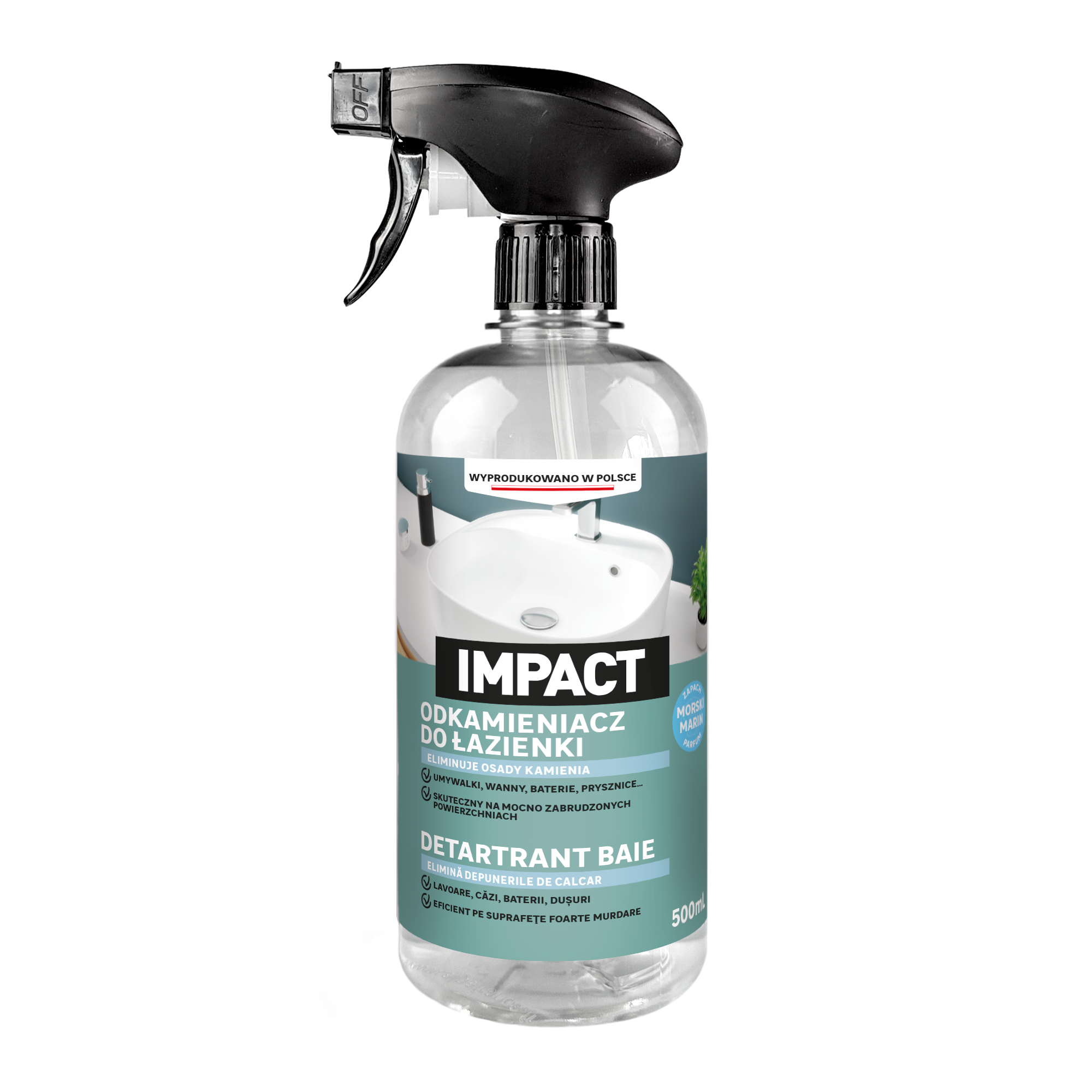 Odkamieniacz do łazienki Impact skutecznie usuwa kamień ze wszystkich powierzchni w łazience, nawet pionowych. Pozostaw na kilka minut, aby uzyskać gładkie i czyste powierzchnie. Rozprowadza przyjemny morski zapach w pomieszczeniu