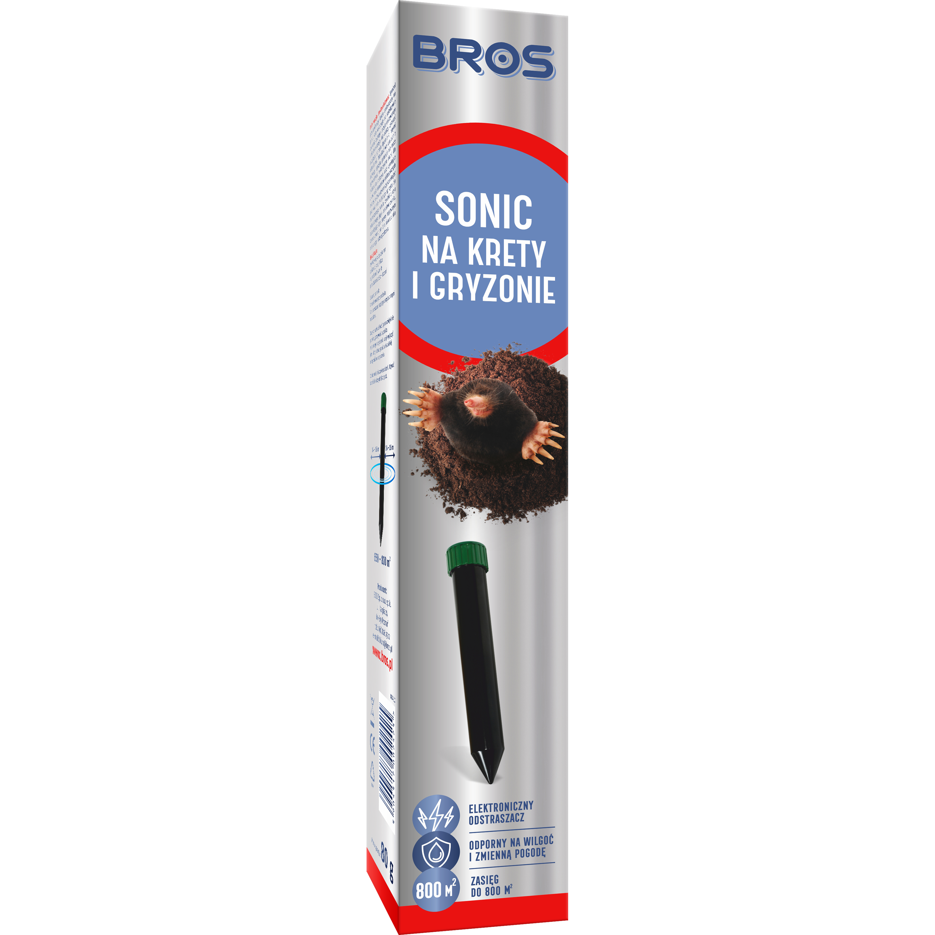 BROS Sonic skutecznie odstrasza krety, nornice i inne ziemne gryzonie. Działa w sposób przyjazny dla środowiska, bez konieczności użycia środków chemicznych. Emituje sygnały dźwiękowe o częstotliwości 400 Hz odstraszając krety i gryzonie obdarzone doskonałym zmysłem słuchu i zdolnością odczuwania drgań. W zależności od rodzaju gleby zabezpiecza obszar od 500 do 600 m2. Szczelna obudowa zapewnia sprawne działanie przez wiele miesięcy niezależnie od pory roku i warunków pogodowych.