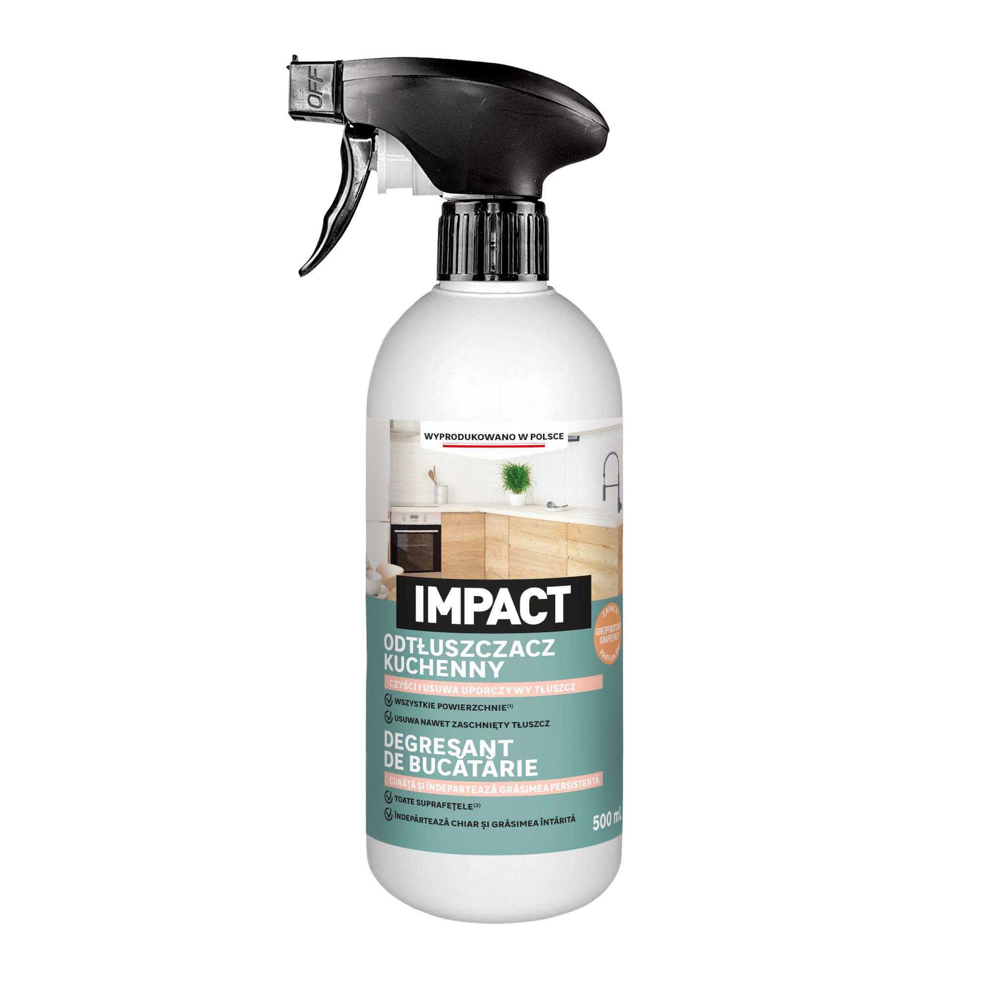 Ultramocny odtłuszczacz kuchenny Impact dokładnie czyści i odtyka wszystkie powierzchnie w Twojej kuchni. Rozpuszcza nawet smażone tłuszcze. Idealny do piekarników, płyt grzewczych, grilli itp. Pozostawia przyjemny cytrusowy zapach. Nadaje się do kontaktu z żywnością po dokładnym spłukaniu. Unikaj stosowania na powierzchniach aluminiowych lub nieobrobionych powierzchniach z surowego drewna, ponieważ może to spowodować plamy na powierzchni.