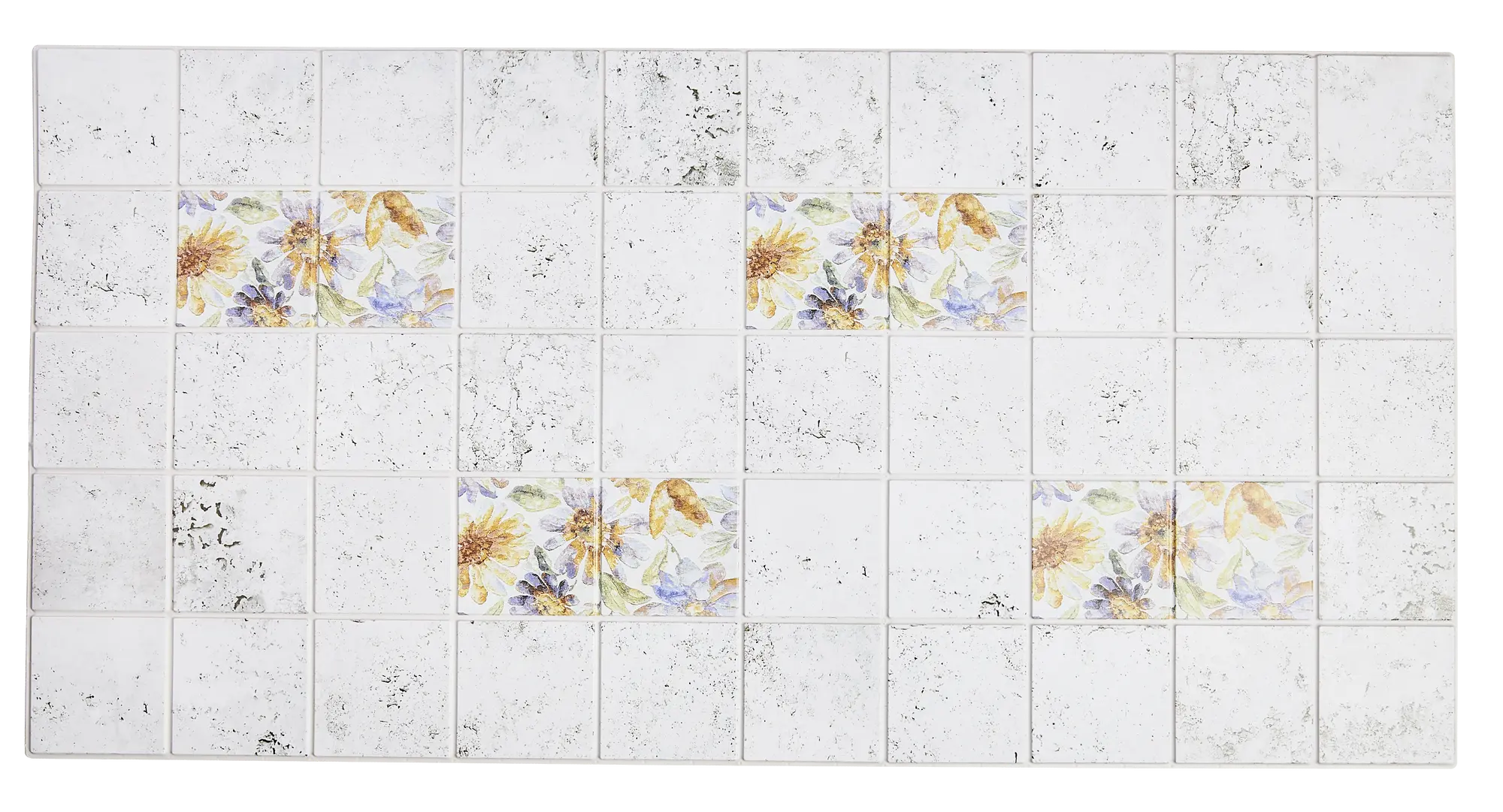 Panel ścienny pcv Kuchnia stworzony do dekoracji i ochrony ściany w kuchni lub łazience. Panel imituje biało-szare postarzane płytki ceramiczne z motywem polnych kwiatów.