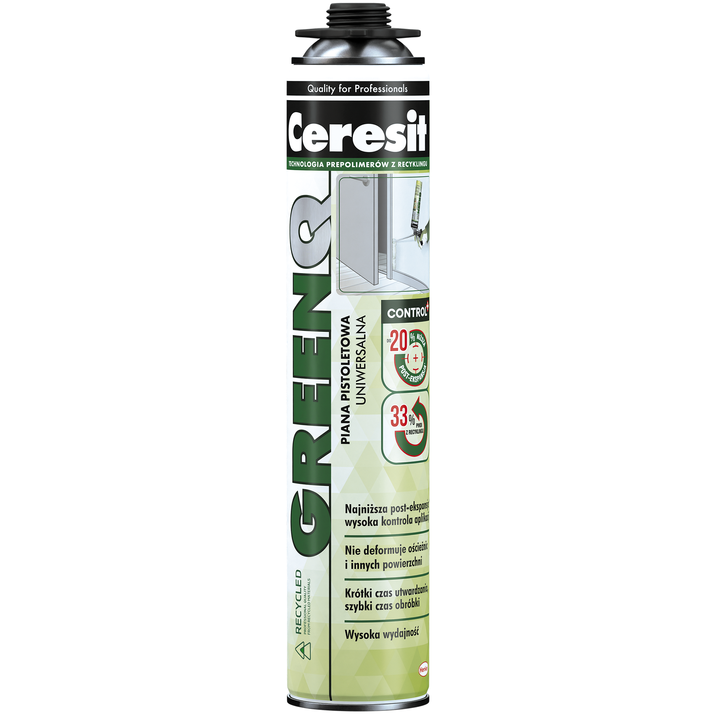 Piana poliuretanowa niskoprężna z PMDI z recyklingu. Jednoskładnikowa, niskoprężna piana o obniżonej post-ekspansji, wyprodukowana z użyciem PMDI pochodzącego z recyklingu. Właściwości: najniższa post-ekspansja, wysoka kontrola aplikacji, nie deformuje ościeżnic i innych powierzchni, krótki czas utwardzania, szybki czas obróbki, wysoka wydajność 33% PMDI z recyklingu. Puszka w 25% z metalu z recyklingu. Niskoprężna do wnętrz i na zewnątrz. Nieszkodliwa dla ozonosfery. Piana Ceresit GREENQ CONTROL służy do osadzania parapetów, szafek instalacyjnych, skrzynek roletowych, itp.; osadzania i uszczelniania ościeżnic drzwiowych i okiennych (przy czym montaż ten powinien być wykonany z użyciem łączników mechanicznych). Można jej używać także do wykonywania izolacji termicznej i akustycznej, do wypełniania szczelin, do wypełniania przepustów, połączeń elementów oraz do uzupełniania ubytków w miejscach rozkuć po osadzeniu rur, przewodów itp. Ma znakomitą przyczepność do betonów, murów, tynków, metali, drewna, styropianu, papieru, powłok malarskich i tworzyw sztucznych (z wyjątkiem polietylenu, teflonu, silikonu).