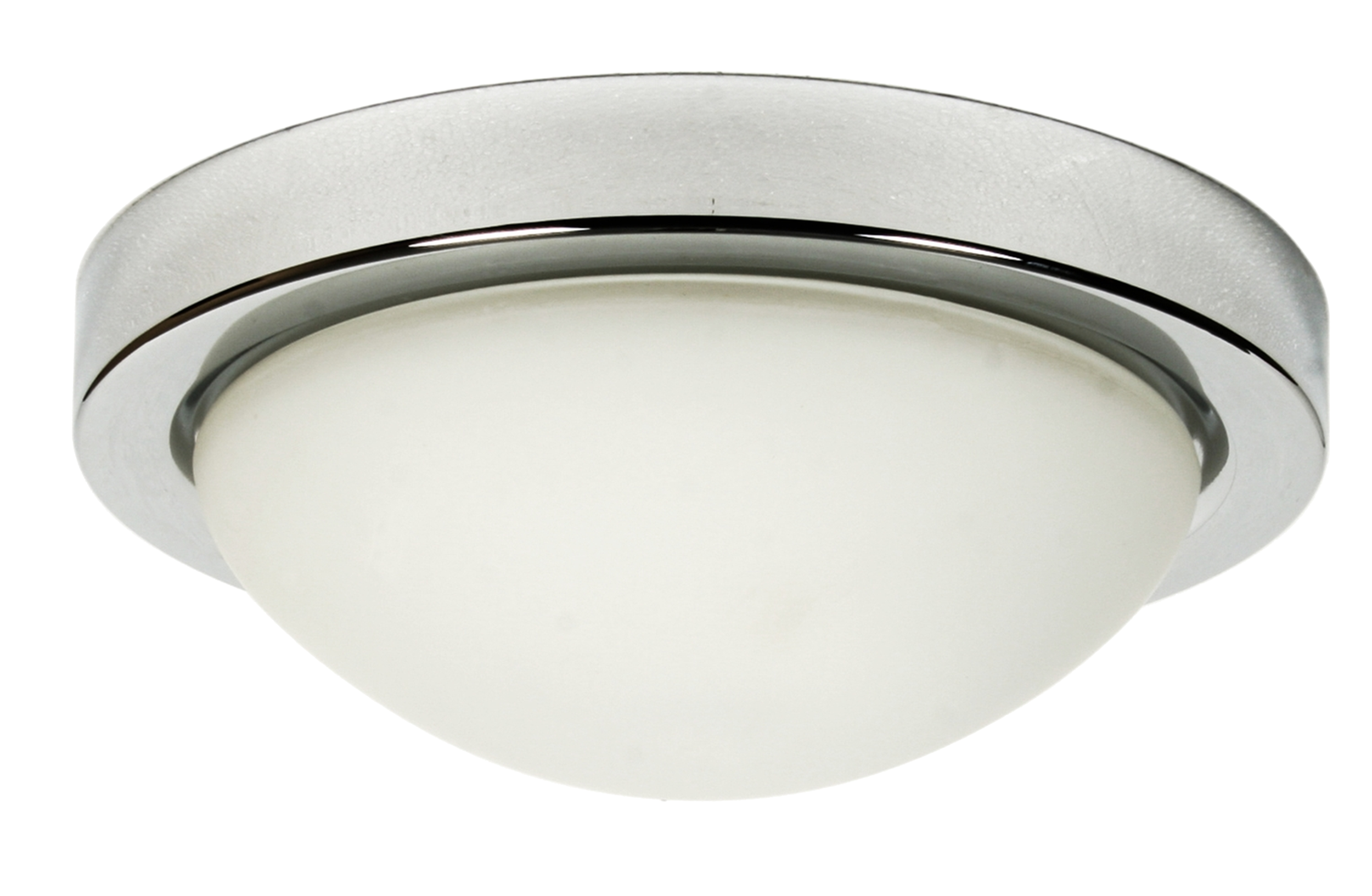 Plafon bryzgoszczelny IP 44 to eleganckie połączenie metalu i szkła, biały klosz gięty otoczony metalowym ringiem.Idealny na przedpokój, do kuchni i łazienki
