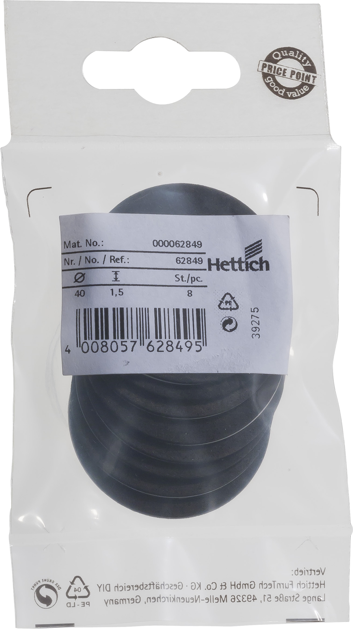 Podkładki meblowe antypoślizgowe 40 mm 8 szt. Hettich pozwalają na zabezpieczenie nóg meblowych oraz innych powierzchni mebli mających kontakt z podłogą przed zarysowaniami i przetarciami. Doskonale sprawdzą się na panelach, desce podłogowej czy parkiecie. W ofercie dostępne są podkładki samoprzylepne, wbijane, wciskane oraz wkręcane. Sposób montażu należy dobrać do materiału wykonania nogi, powierzchni do której podkładki mają być mocowane oraz obciążenia.
