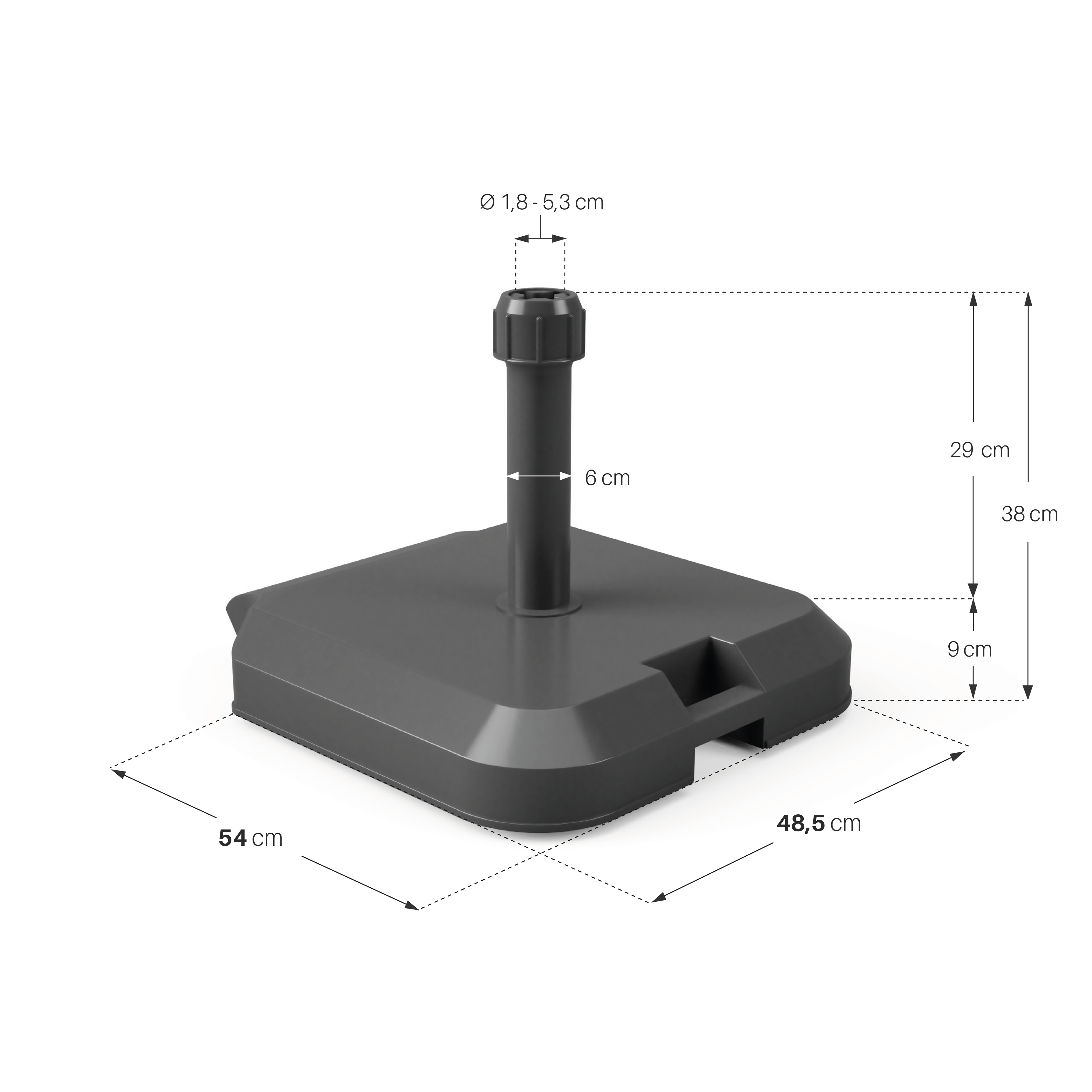 Muy buena estabilidad para nuestra sombrilla de gran diamtreo de tubo y de gran diámetro de unbrela. Facil de mover todo y su gran peso, gracias a sus 2 ruedas en el lado contrario del mango. El peso de material de hormigon queda muy bien escamoteado por la cubierta plástica. Lo tenenos siempre a la intemperie.