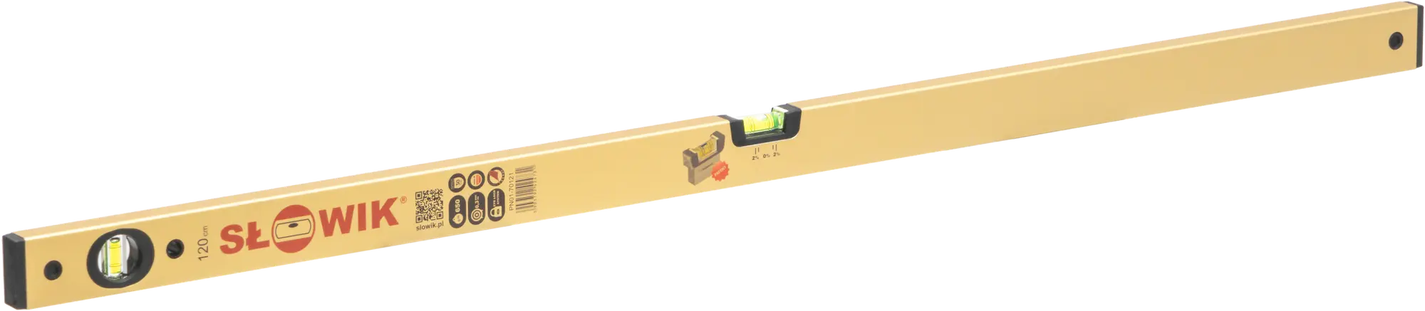 Libella poziomu posiada spadek 2%. Zakończenia z tworzywa wysokoudarowego. Gładka anodowana powierzchnia w kolorze złotym, łatwa w czyszczeniu.