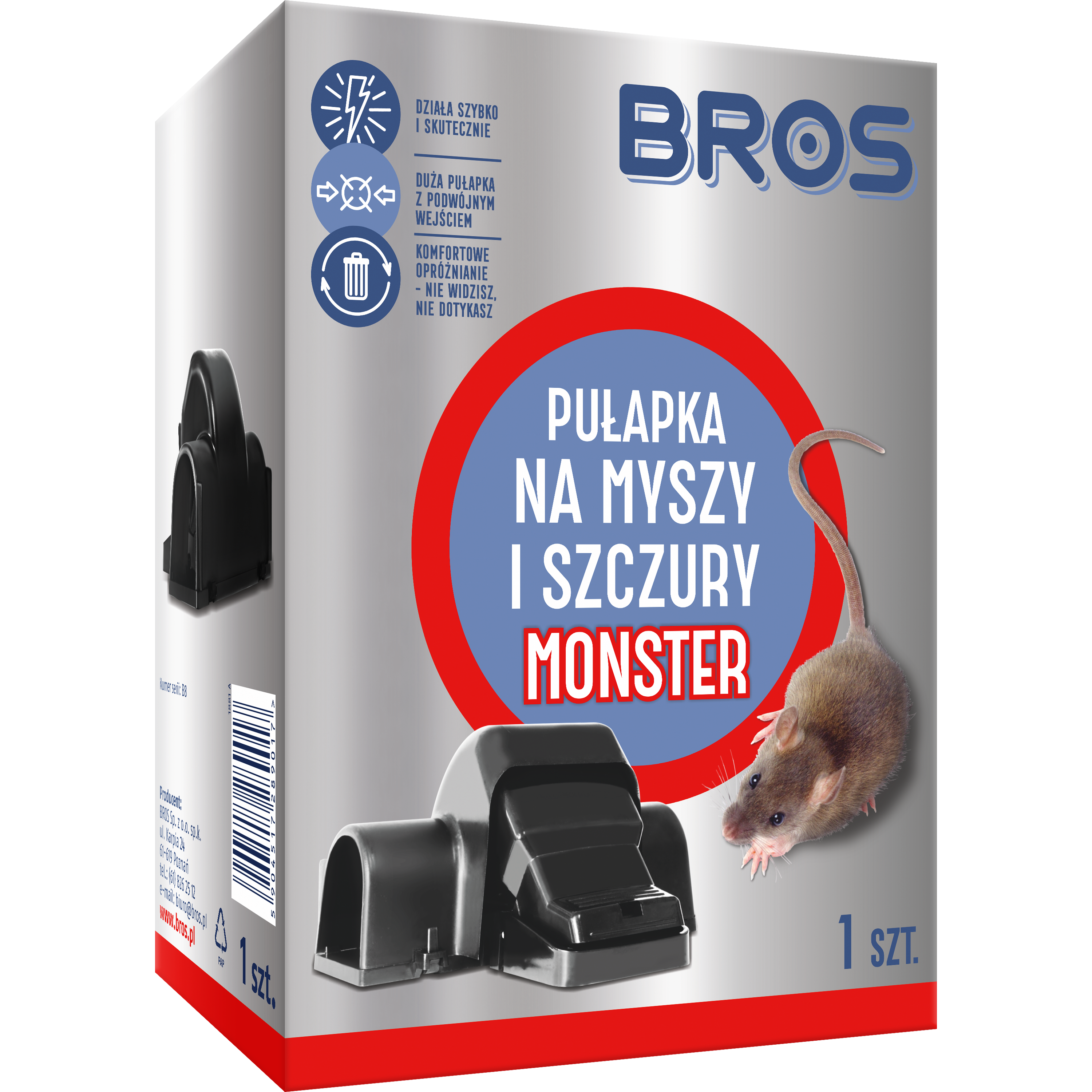 Duża, dwustronna pułapka na myszy i szczury typu „nie widzisz - nie dotykasz”, służąca do wyłapywania gryzoni zarówno w pomieszczeniach, jak i na zewnątrz. Pozwala na opróżnienie pułapki w komfortowy sposób - bez konieczności oglądania i dotykania złapanego gryzonia. Specjalna konstrukcja przypominająca karmnik pozwala na dosunięcie pułapki do krawędzi ściany, gdzie gryzonie najczęściej się przemieszczają, a wejścia z dwóch stron pułapki zwiększają szanse na złapanie gryzonia.