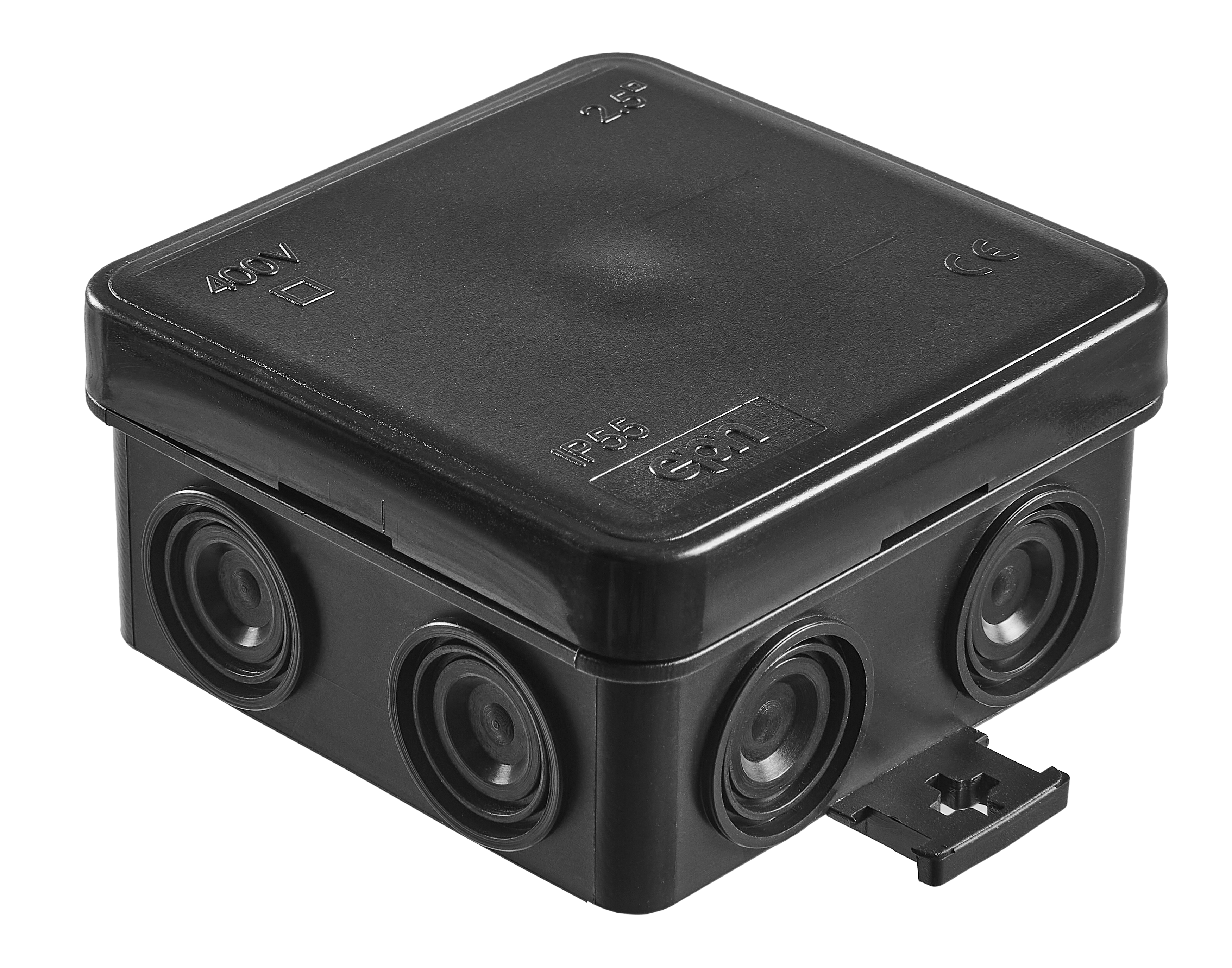 Puszka natynkowa, hermetyczna E o wymiarach 75x75x39, czarna. Stopień ochrony IP55. Bezhalogenowa. Puszka łączeniowa posiada 7 wypustów do montażu. Pokrywa na zatrzask, specjalny uchwyt do koryt kablowych. Montaż zarówno ścienny jak i sufitowy.