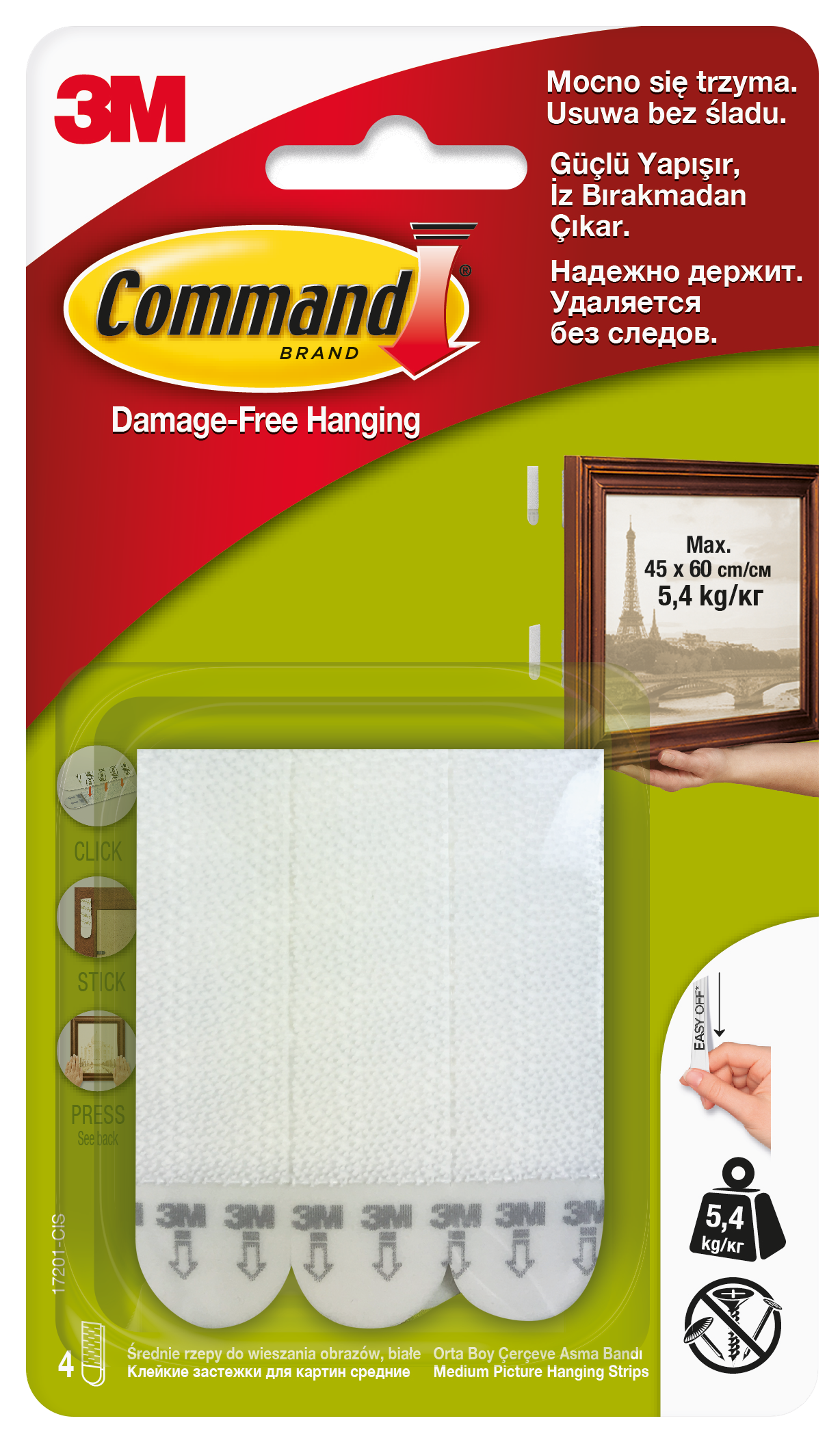 Duże rzepy do wieszania obrazów Command zastępują gwoździe i śrubokręty, sprawią, że wieszanie obrazów i ramek będzie proste i szybkie. Wystarczy jeden klik, a już wiadomo, że rzepy Command są poprawnie umocowane na ścianie. Usunięcie rzepów Command jest równie proste jak ich aplikacja, szczególnie kiedy chce się dowolnie zmienić położenie obrazu lub go zdjąć. Rzepy Command nie niszczą powierzchni oraz samych obrazów i ramek.