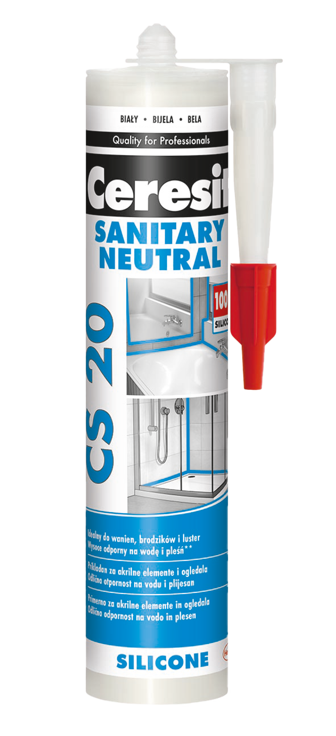 Ceresit CS 20 to w 100% neutralny silikon sanitarny. Ze względu na wysoką przyczepność i odporność jest szczególnie polecany do uszczelniania wanien i brodzików akrylowych. Ze względu na swój neutralny charakter zalecany jest również do luster. CS 20 służy do uszczelniania elementów wykonanych z materiałów takich jak: ceramika, emalia, powierzchnie szkliwione, metal, drewno, PVC, poliwęglan, szkło akrylowe (PMMA), lustra, beton