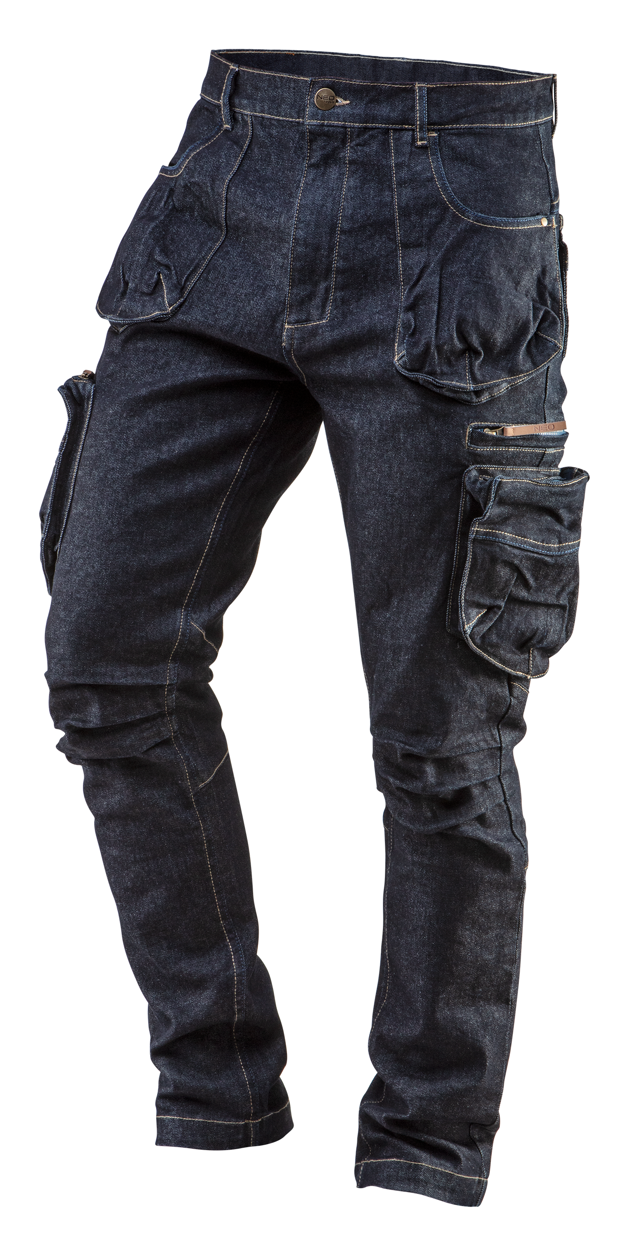 Spodnie robocze 5-kieszeniowe DENIM, dodatek elastanu zapewnia lepsze dopasowanie i większy komfort noszenia, wielofunkcyjne i pojemne kieszenie, w kroku i pod kolanem panel podnoszący komfort użytkowania, profilowane kolano, dodatkowa kieszeń na dole nogawki, skórzane wszywki z logo, wewnętrzna wszywka imienna, unikalny projekt własny, rozmiar XL