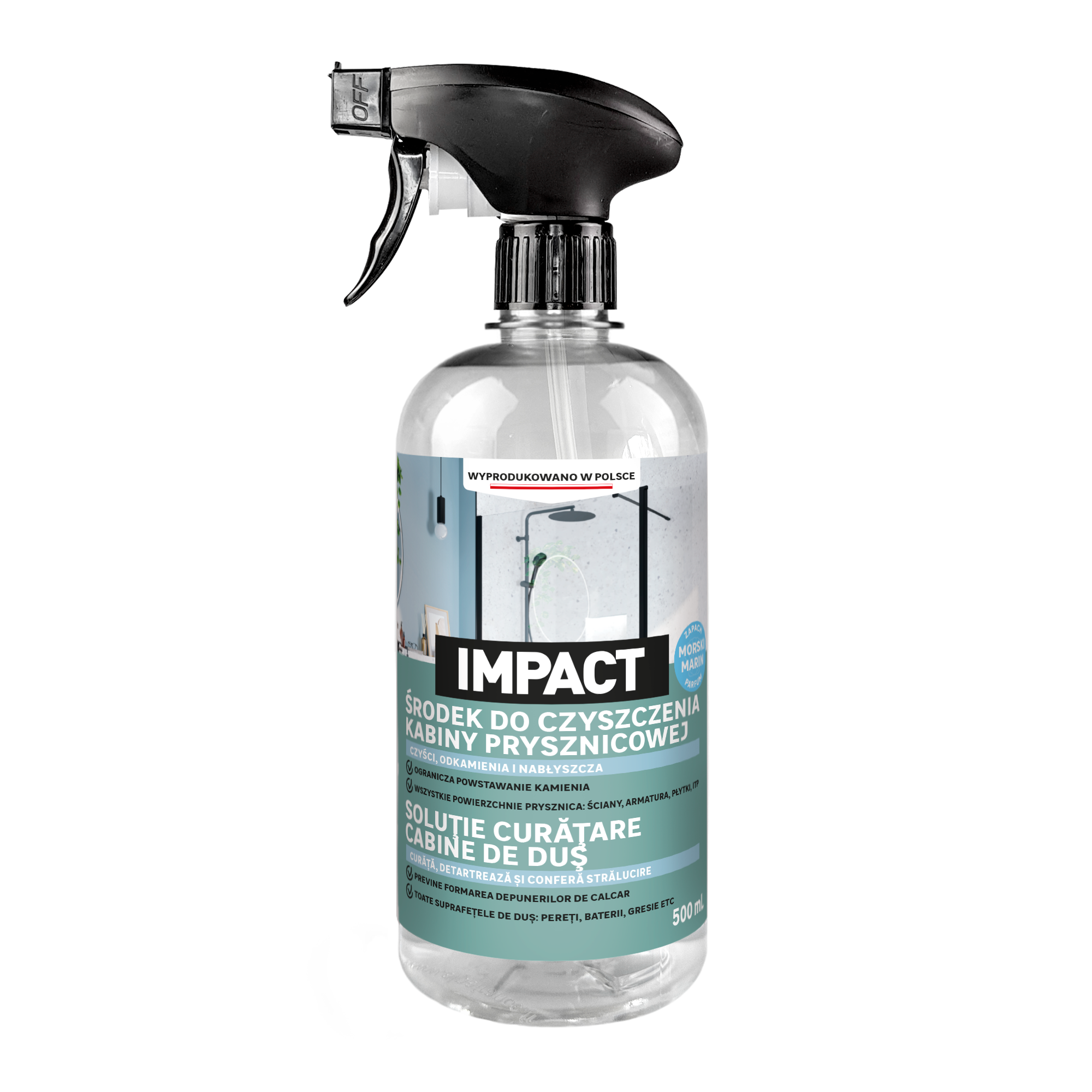 Środek czyszczący do kabin prysznicowych Impact czyści i odkamienia wszystkie powierzchnie w kabinie prysznicowej (półki, kran, ściany, stal nierdzewna, kafelki itp.). Nie stosować na powierzchniach porowatych (marmur, kamień naturalny itp.).