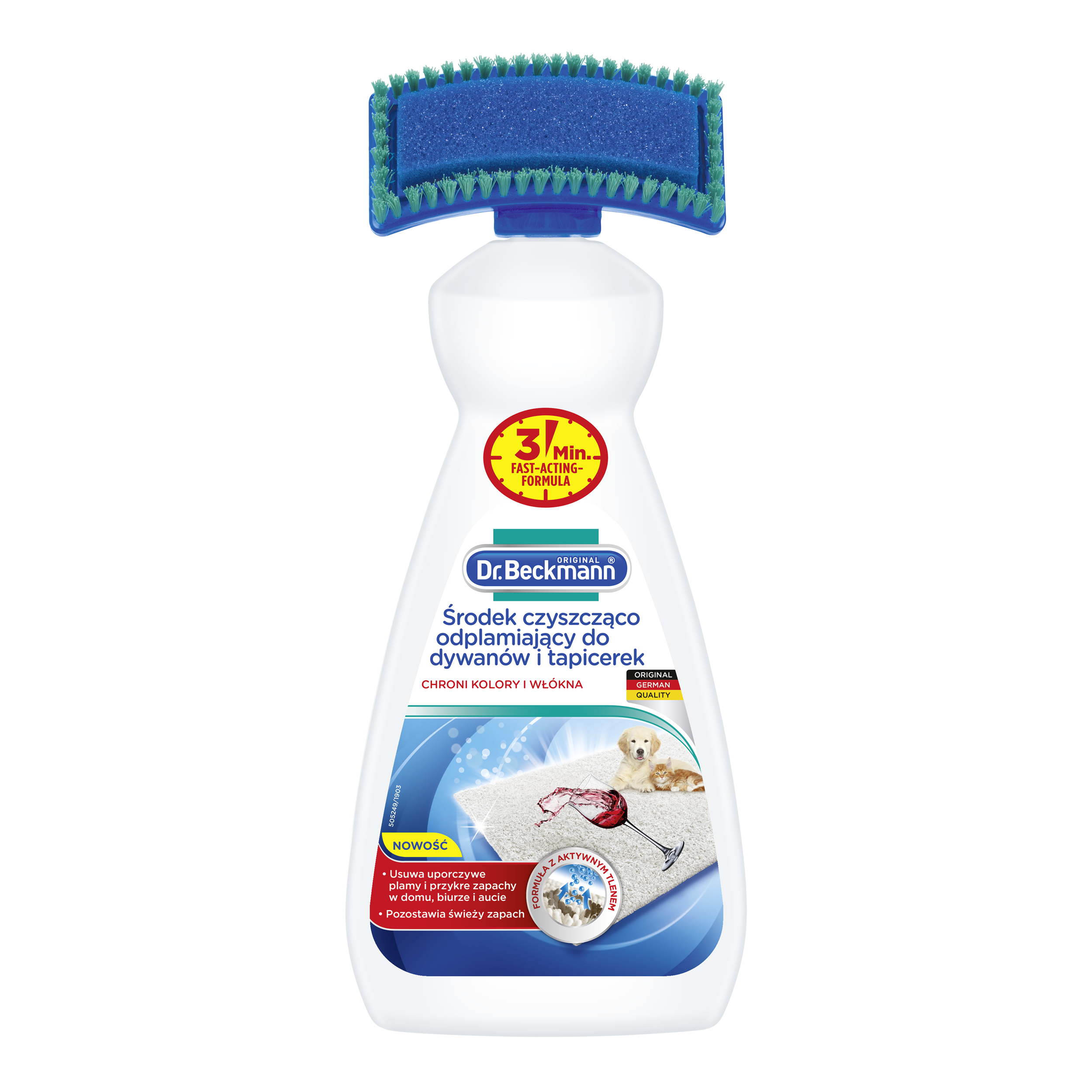 Dr.Beckmann Środek czyszcząco odplamiający do Dywanów i Tapicerek 650 ml ze szczotką. Formula z aktywnym tlenem. Bez trudu usuwa nawet najbardziej uporczywe plamy i przykre zapachy. Specjalny aplikator w formie szczotki pozwala na optymalne naniesienie formuły z aktwynym tlenem i usunięcie plam z czerwonego wina, kawy, soków, coli, herbaty, tłuszczu, oleju, makijażu, brudu oraz plam spowodowanych przez zwierzęta na dywanach i tapicerce. Specjalne składniki aktywne eliminują przykre zapachy i pozostawiają przyjemną świeżość. Formuła jest łagodna dla kolorów oraz włókien i może być stosowana do wełny. Produkt testowany dermatologicznie. Nie stosować na: aksamicie, jedwabiu, tkaninach wrażliwych na wodę.