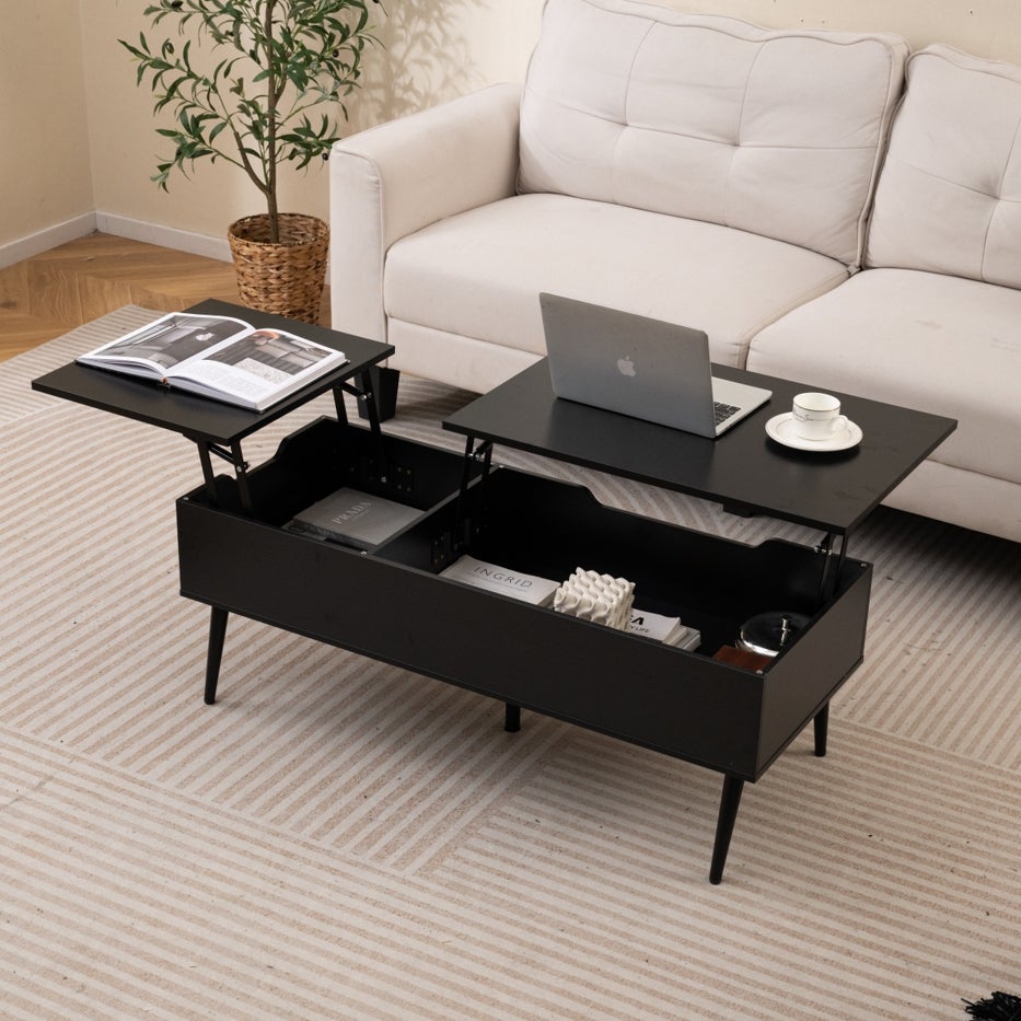 Stolik kawowy z regulacją wysokości, stół do salonu z podnoszonym blatem i 2 ukrytymi półkami, stolik pomocniczy drewniany,biura, (czarny)