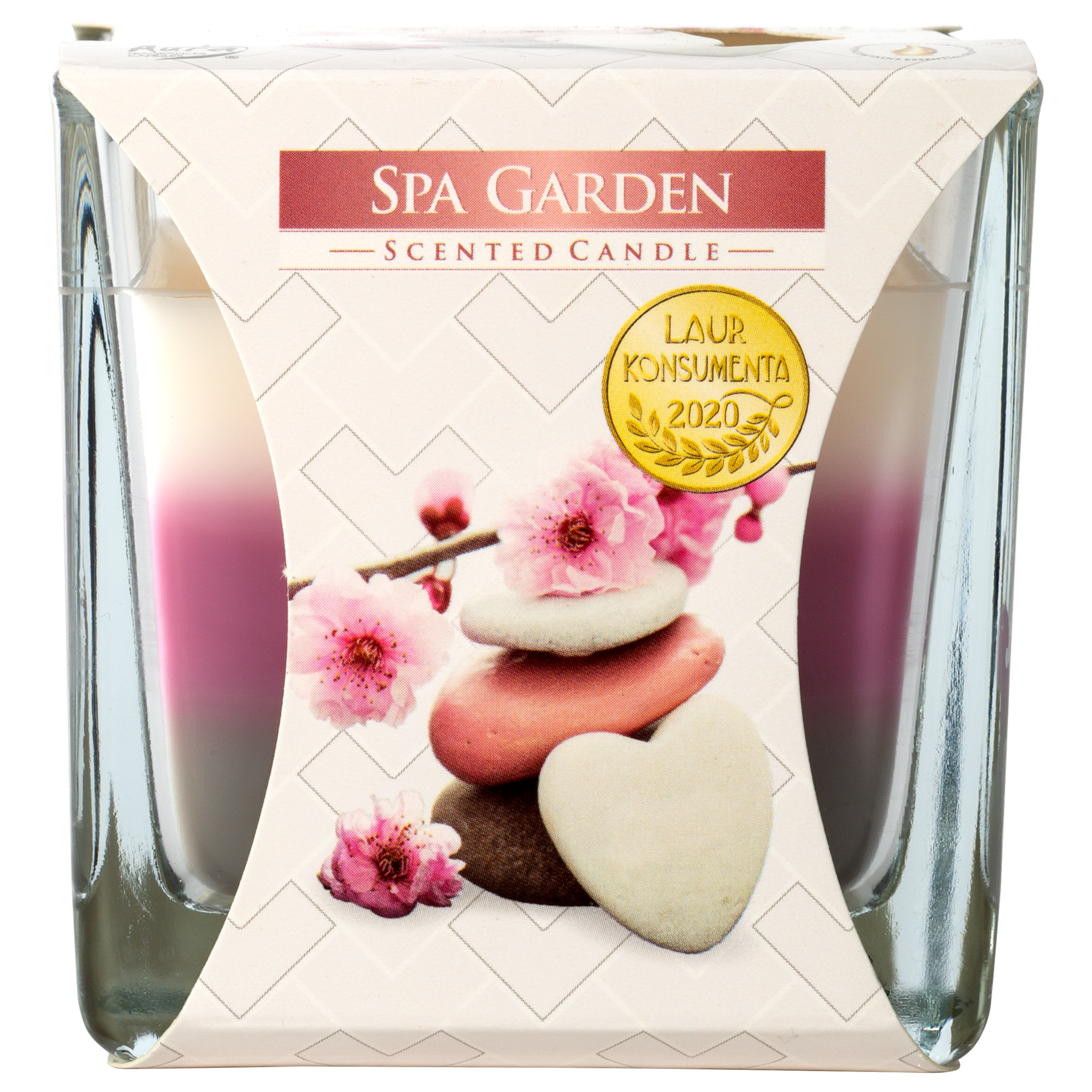Świeca kwadratowa w szkle z trójkolorwą zalewą.