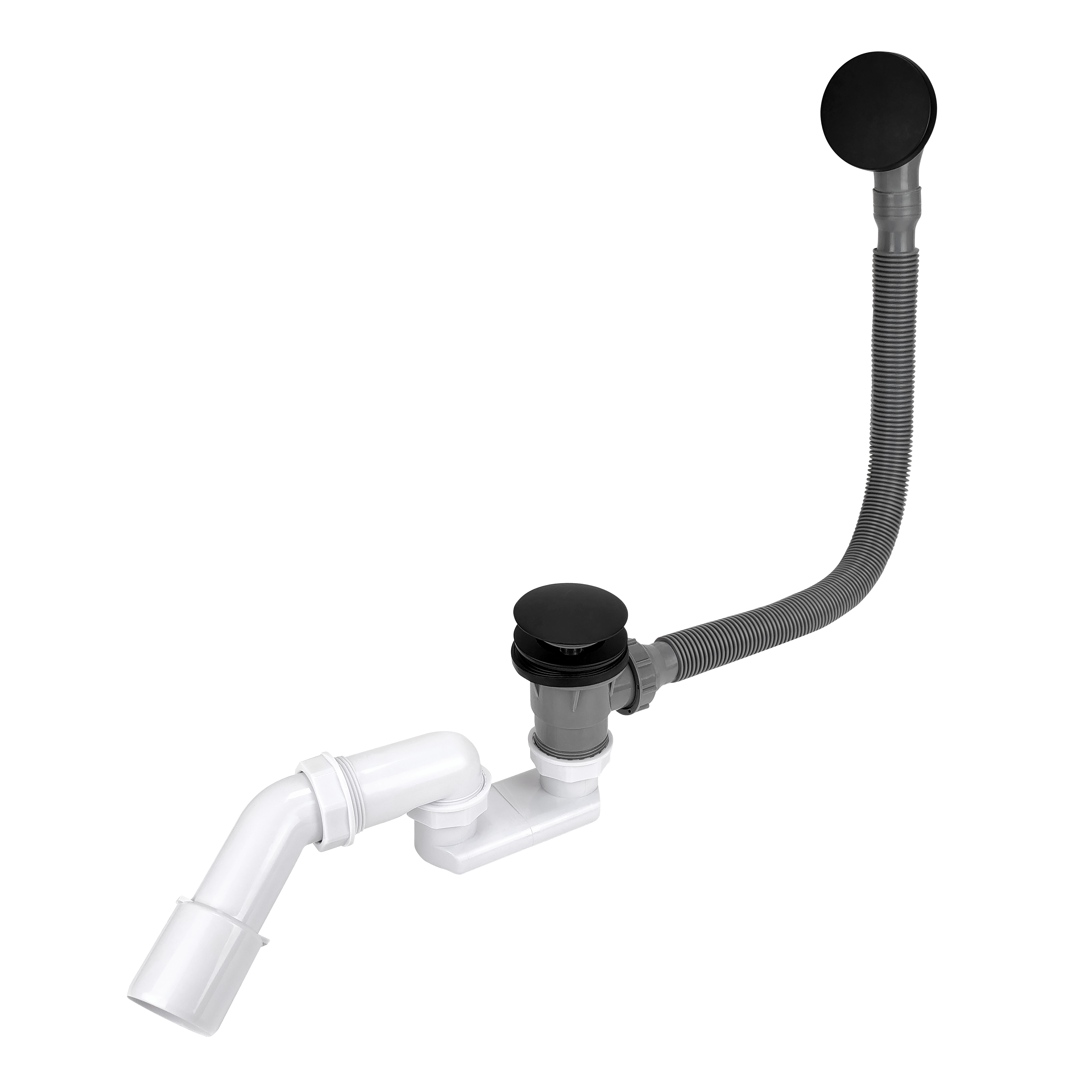 Syfon wannowy z czarnym matowym korkiem klik-klak z mosiądzu. Konstrukcja korka posiada sito wyłapujące - jest wyciągane, co ułatwia czyszczenie. Elastyczna rurka przelewu ma długość 57 cm i zakończona jest zaślepką przelewu w kolorze czarnym wykonaną ze stali. Wysokość syfonu pod wanną to 125 mm.