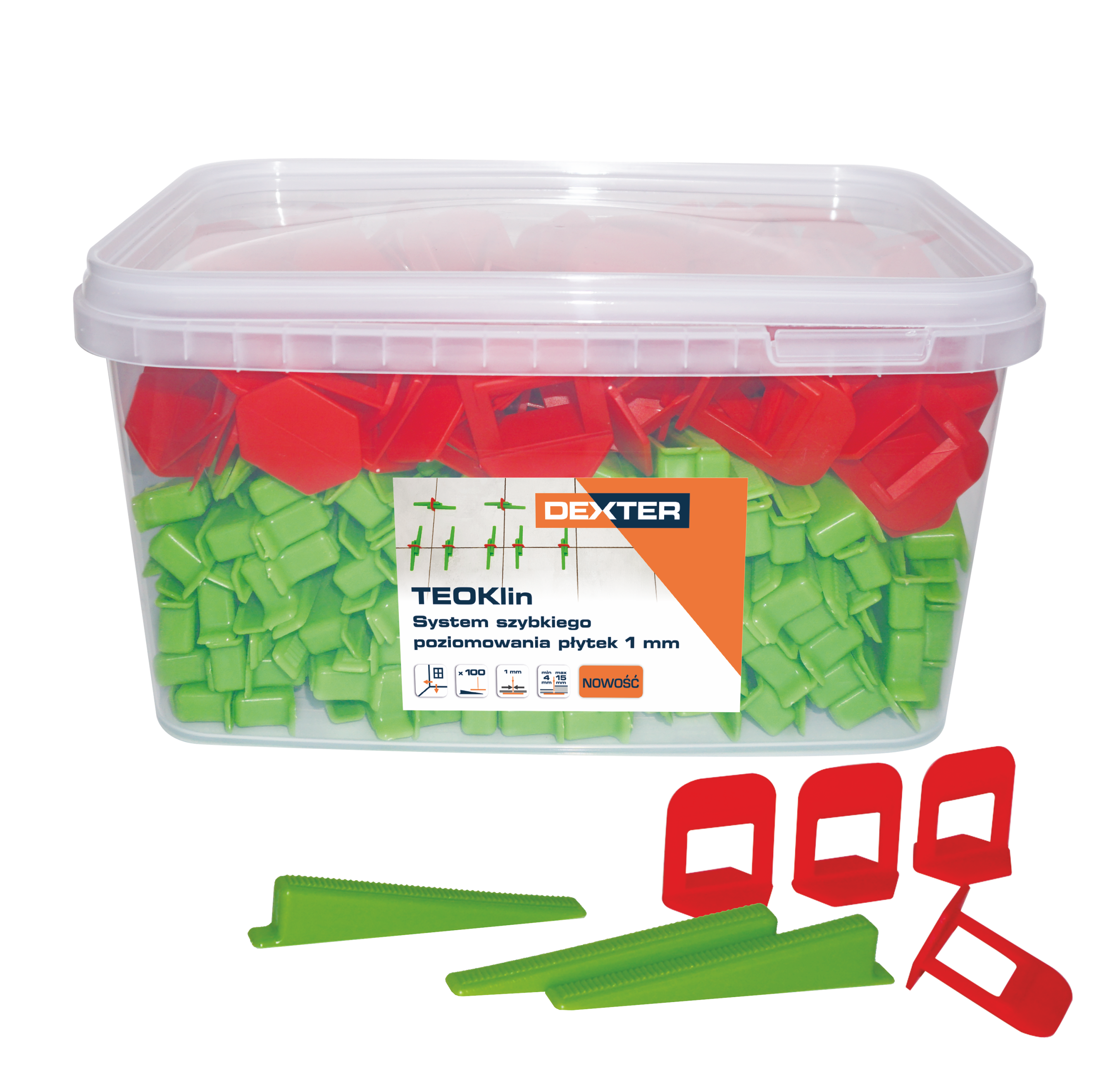 System zapewniający poziomowanie płytek. Zawartość zestawu: 100 żółtych elementów typu "TEO" o grubości ścianki 1 mm, 200 zielonych elementów typu "KLIN"