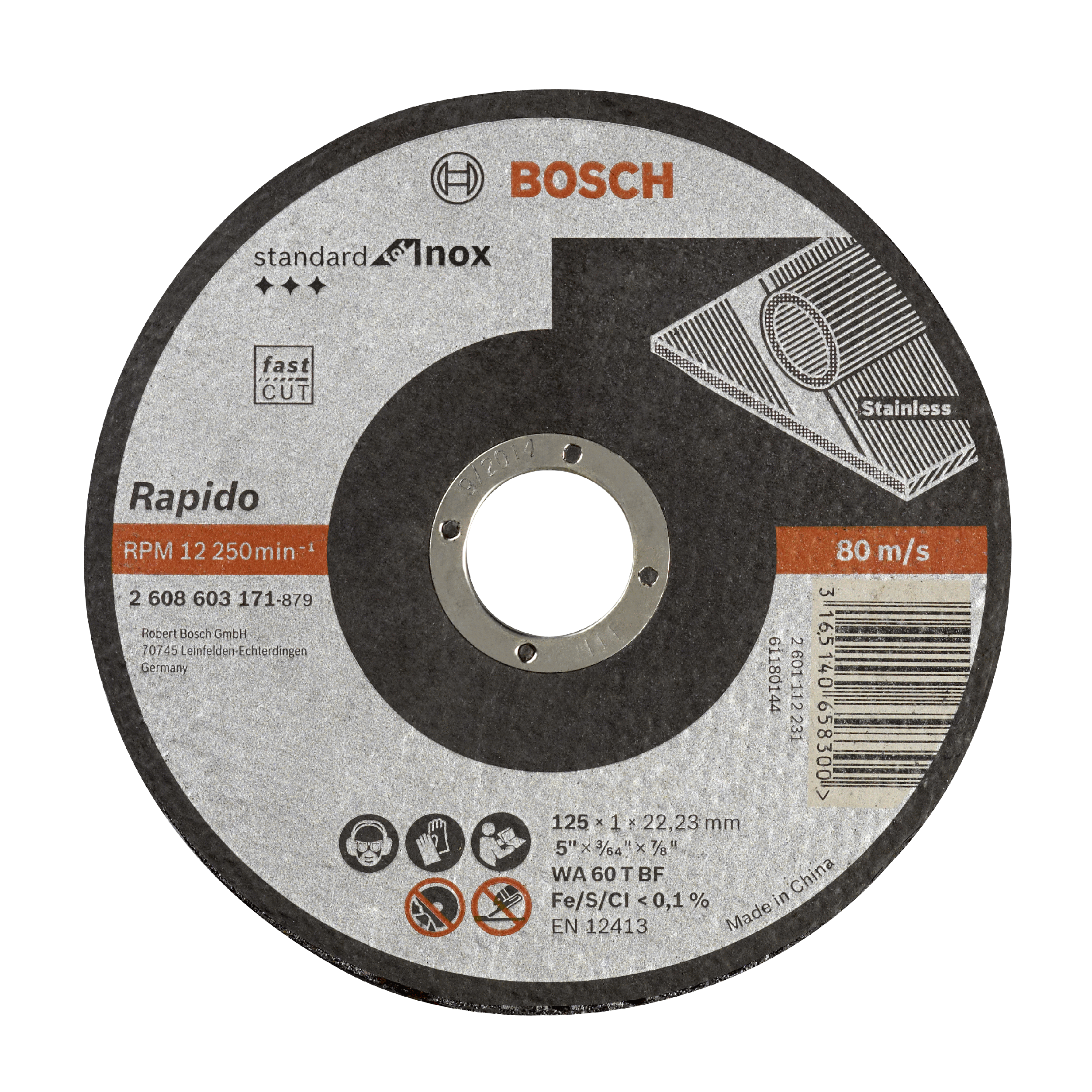 Tarcza do szlifierki kątowej Bosch o średnicy 125 mm i grubości 1 mm służy do cięcia stali nierdzewnej i szlachetnej. Średnica otworu tarczy to 22,23 mm pozwala na pracę z większością szlifierek kątowych. Maksymalna prędkość obrotowa wynosi 12250 obr/min.