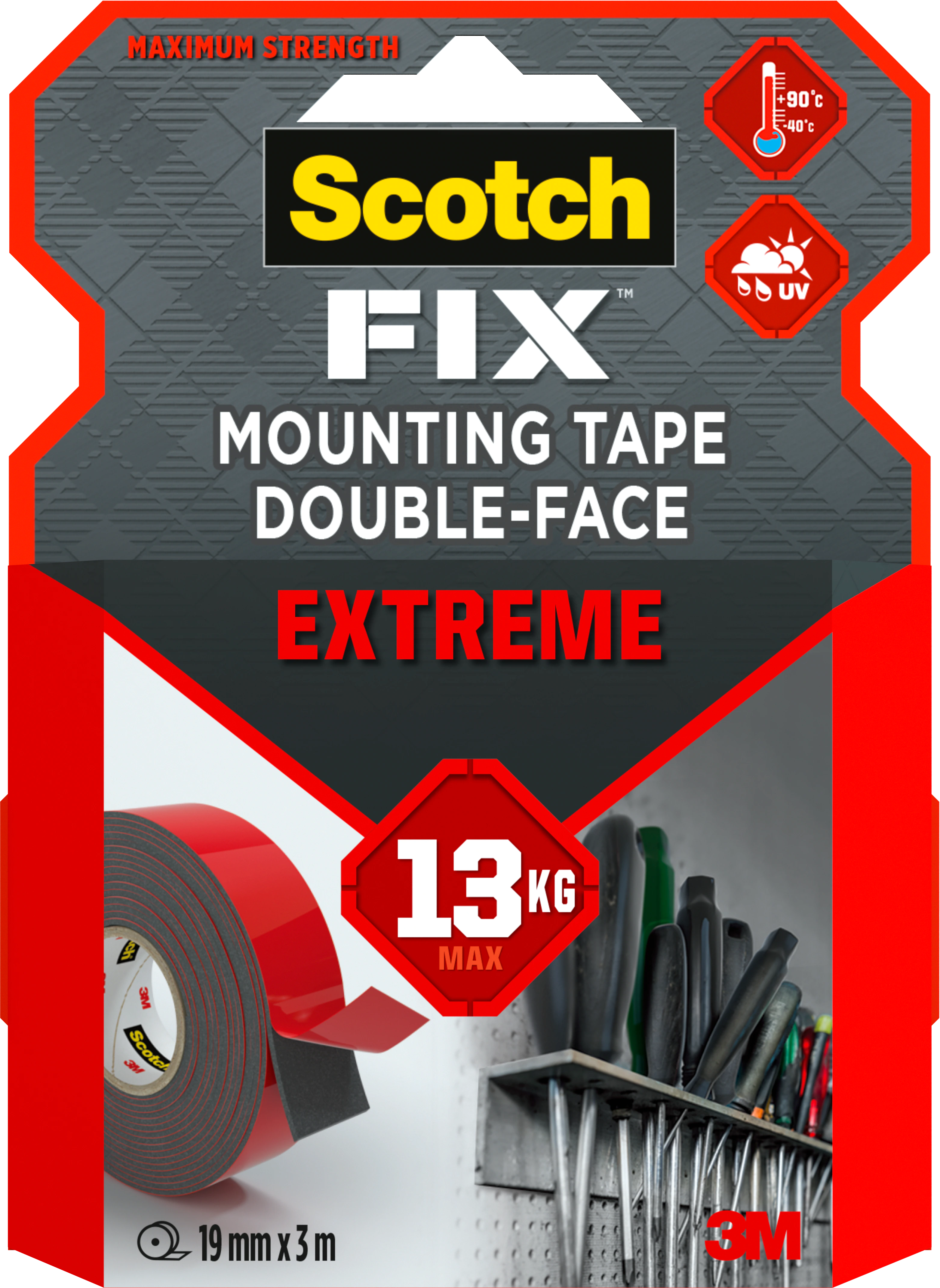 Do najcięższych prac wybierz najmocniejszą dwustronną taśmę mocującą Scotch-Fix Extreme z zaawansowaną technologią 3M. Wyposażona w mocny, trwały klej, ta dwustronna taśma przeciwstawia się grawitacji, utrzymując przedmiot o wadze do 13 kg. Jest odporna na warunki atmosferyczne i zapewnia długotrwałe wiązanie, zarówno wewnątrz, jak i na zewnątrz. Niezależnie od tego, czy montujesz ozdobne gzymsy w swoim nowym mieszkaniu, czy organizujesz ścianę w garażu, z supermocną dwustronną taśmą montażową Scotch-Fix wykonasz to zadanie szybko, łatwo i bez użycia narzędzi.