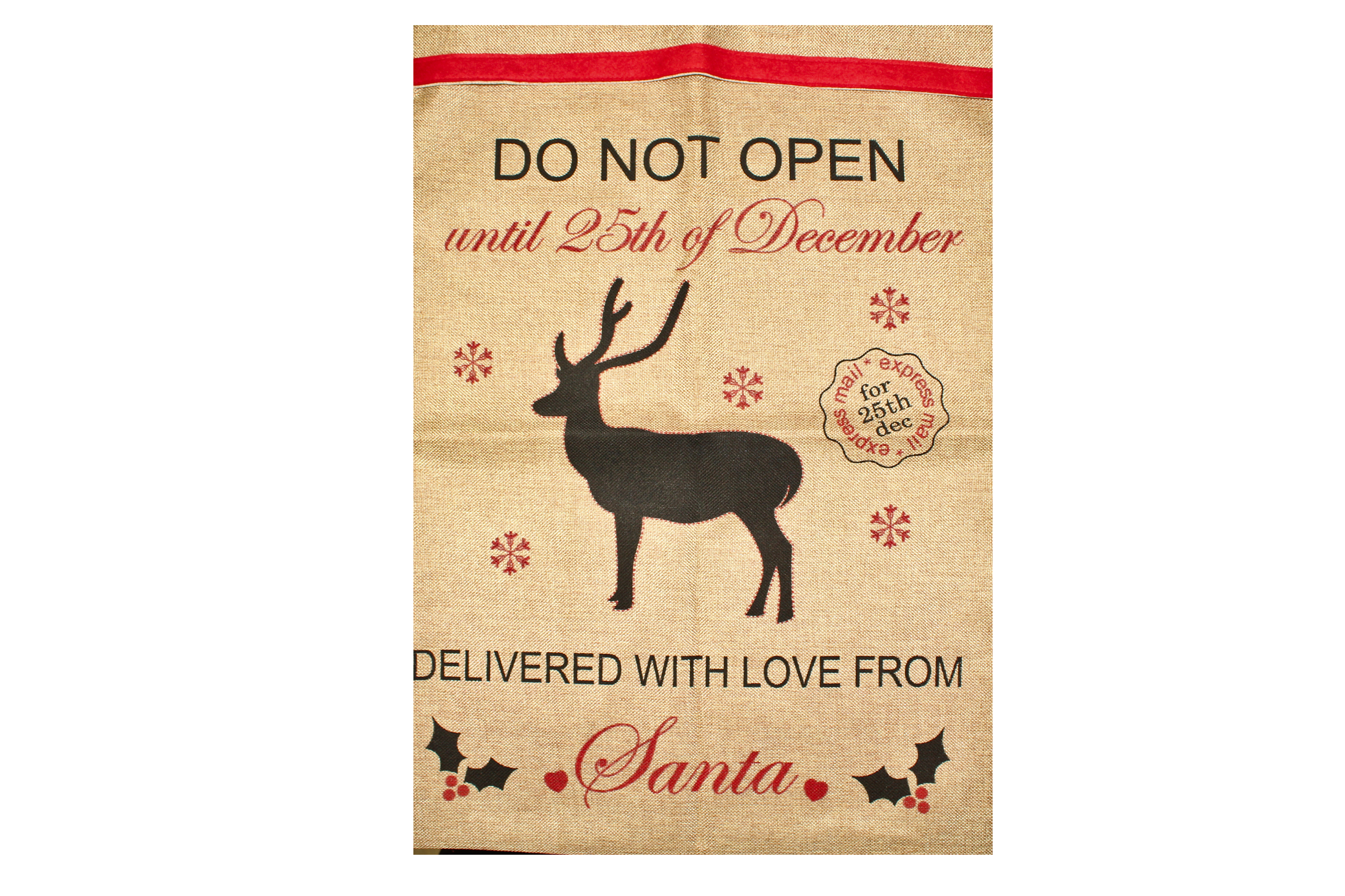 Jutowy worek prezenetowy z reniferem i napisem. Worek o wymiarach 70x50 cm.