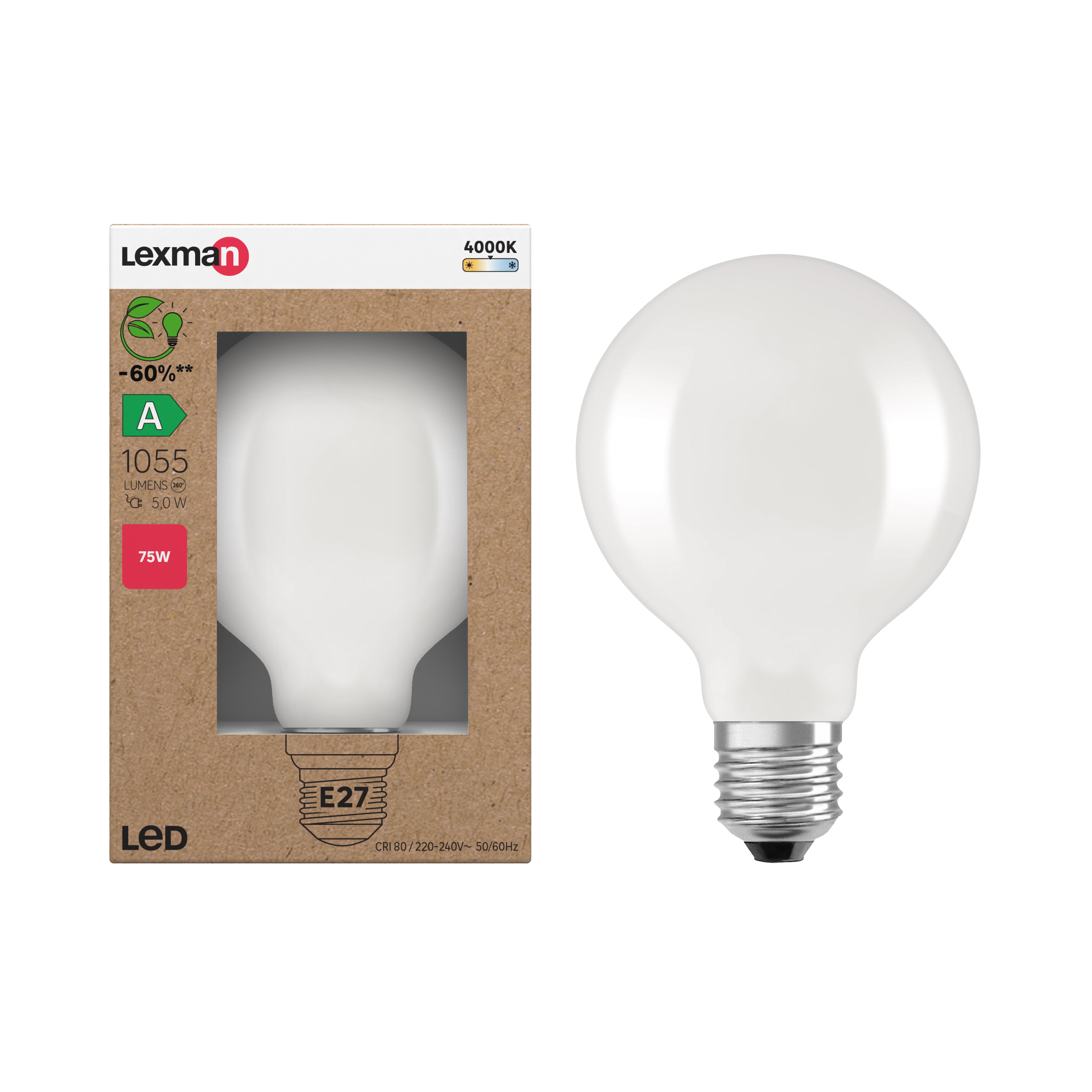 Mleczna żarówka LED w kształcie kuli, średnica 95 mm z dużą trzonkiem śrubowym (E27). Ta żarówka ma neutralny współczynnik oddawania barw bieli (400K) i zużywa o 60% mniej energii niż żarówka o klasie energetycznej F o mocy 12,4 W, dzięki klasie energetycznej A. Ta żarówka ma moc wyjściową 1055 lumenów, co odpowiada mocy wyjściowej 75 watów, ale zużywa tylko 5 watów. Ten produkt jest objęty 5-letnią gwarancją