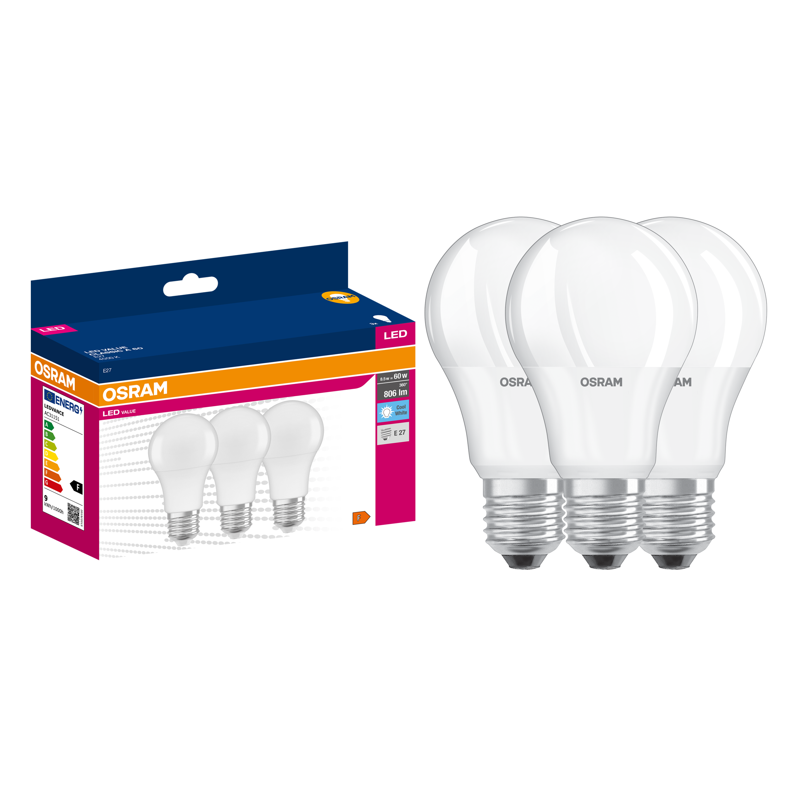 Żarówka LED 3 szt. E27 8 W 806 lm Neutralna biel Osram