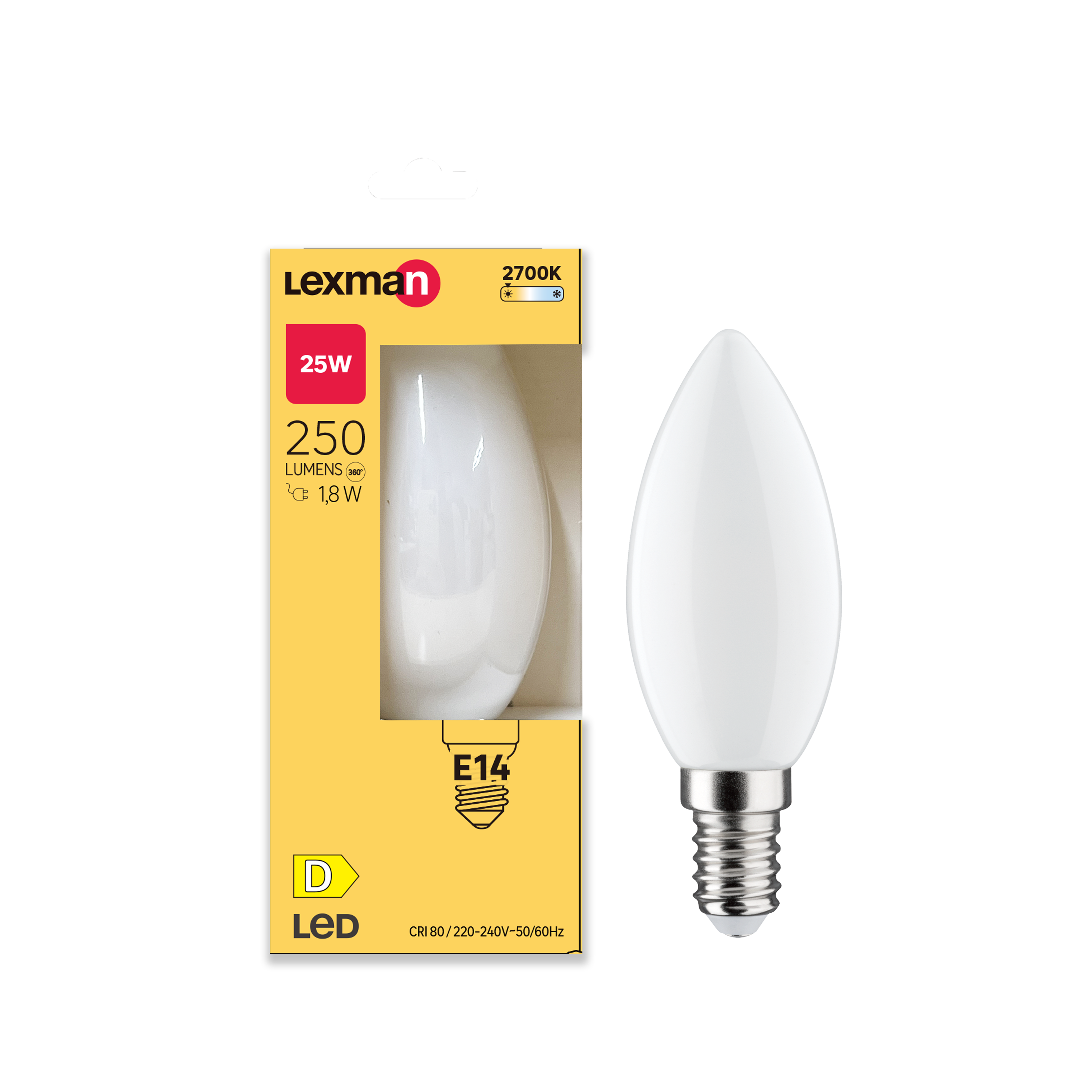 Standardowa żarówka LED w kształcie świecy (średnica 35 mm) z małym gwintem (E14). Ta żarówka charakteryzuje się ciepłym, białym światłem (2700 K), które nada Twoim pomieszczeniom ciepłą atmosferę. Ma moc 250 lumenów, co odpowiada mocy 25 watów, ale zużywa tylko 1,8 wata. Żywotność tej żarówki LEXMAN wynosi 25 000 godzin. 5-letnia gwarancja.