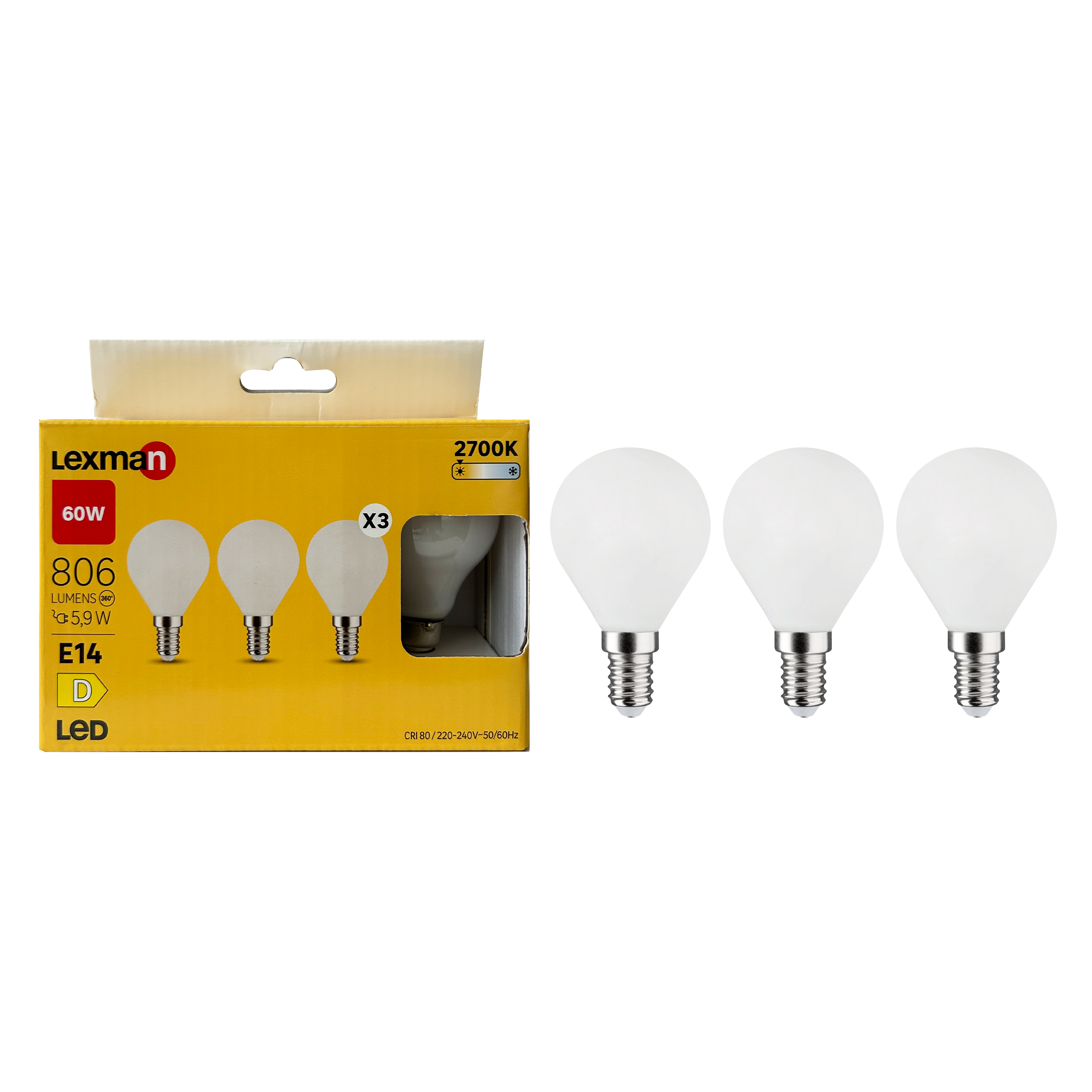 Zestaw 3 białych żarówek LED o średnicy 45mm, z małą podstawą (E14). Ta żarówka ma ciepłe białe oddawanie barw (2700K). Ma moc wyjściową 806 lumenów, co odpowiada mocy wyjściowej 60 watów, ale zużywa tylko 5,9 wata. Ten produkt ma klasę energetyczną D i jest objęty 5-letnią gwarancją