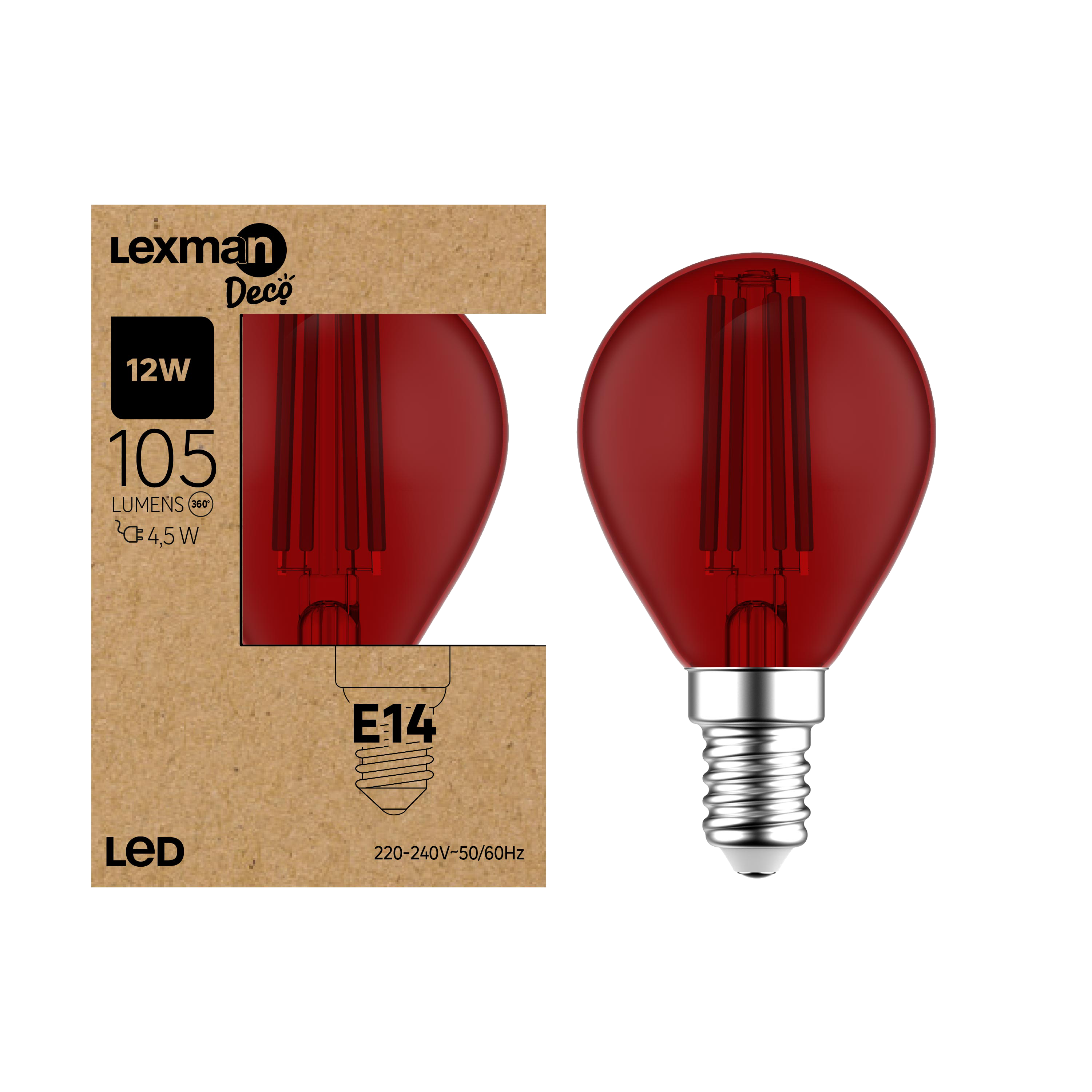 Dekoracyjna żarówka LED o średnicy 45 mm z małą podstawą (E14), ta żarówka ma oddawanie czerwonych kolorów i nie nadaje się do oświetlenia domowego. Ma moc wyjściową 105 lumenów, co odpowiada 12 watom, ale zużywa tylko 4,5 wata. Ten produkt jest objęty 5-letnią gwarancją