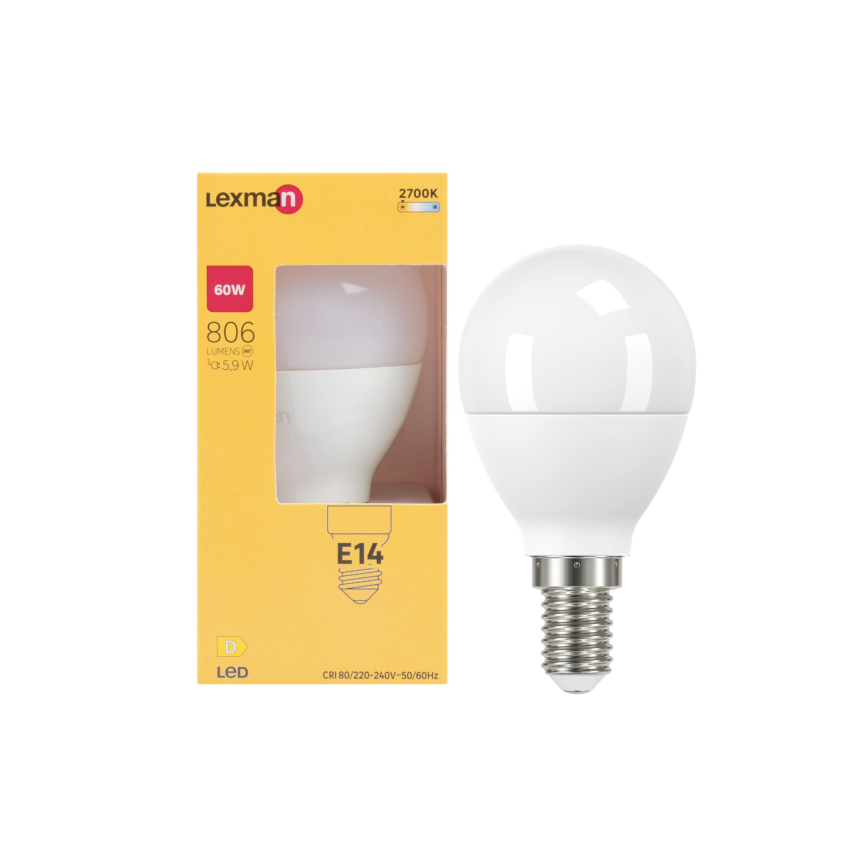 Żarówka o średnicy 45mm, z małą podstawą (E14). Ta żarówka z jej temperaturą będzie miała ciepłe białe oddawanie barw (2700K). Ta żarówka LED ma moc wyjściową 806 lumenów, co odpowiada 60 watom energii, ale zużywa tylko 5,9 wata. Ten produkt ma klasę energetyczną D i jest objęty 5-letnią gwarancją