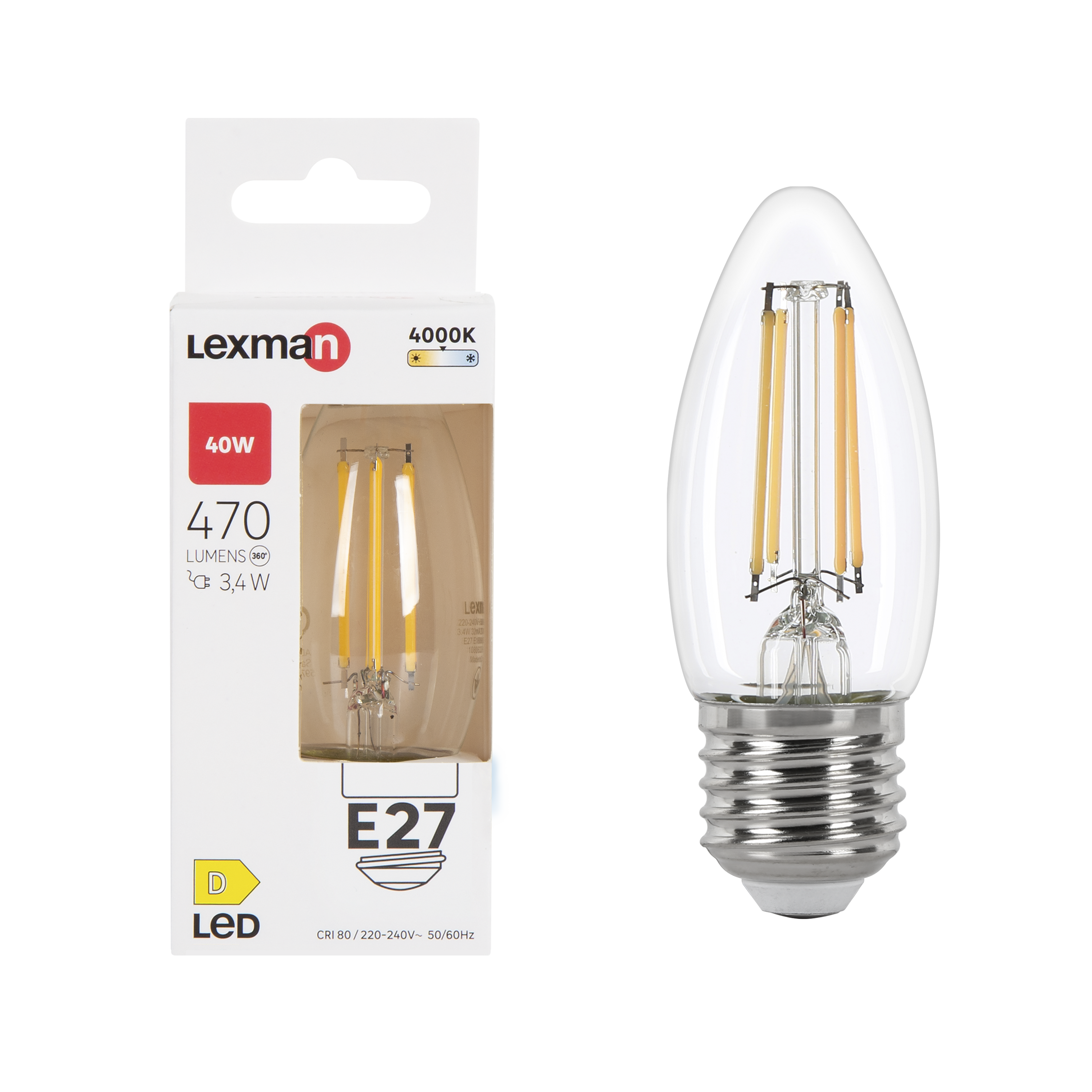 Standardowa żarówka świecowa (średnica 35 mm) z dużym gwintem (E27). Ta żarówka ma neutralne białe oddawanie barw (4000 K) o mocy 470 lumenów, co odpowiada 40 watom energii, ale zużywa tylko 3,4 wata. Ten produkt ma klasę energetyczną D i jest objęty 5-letnią gwarancją.