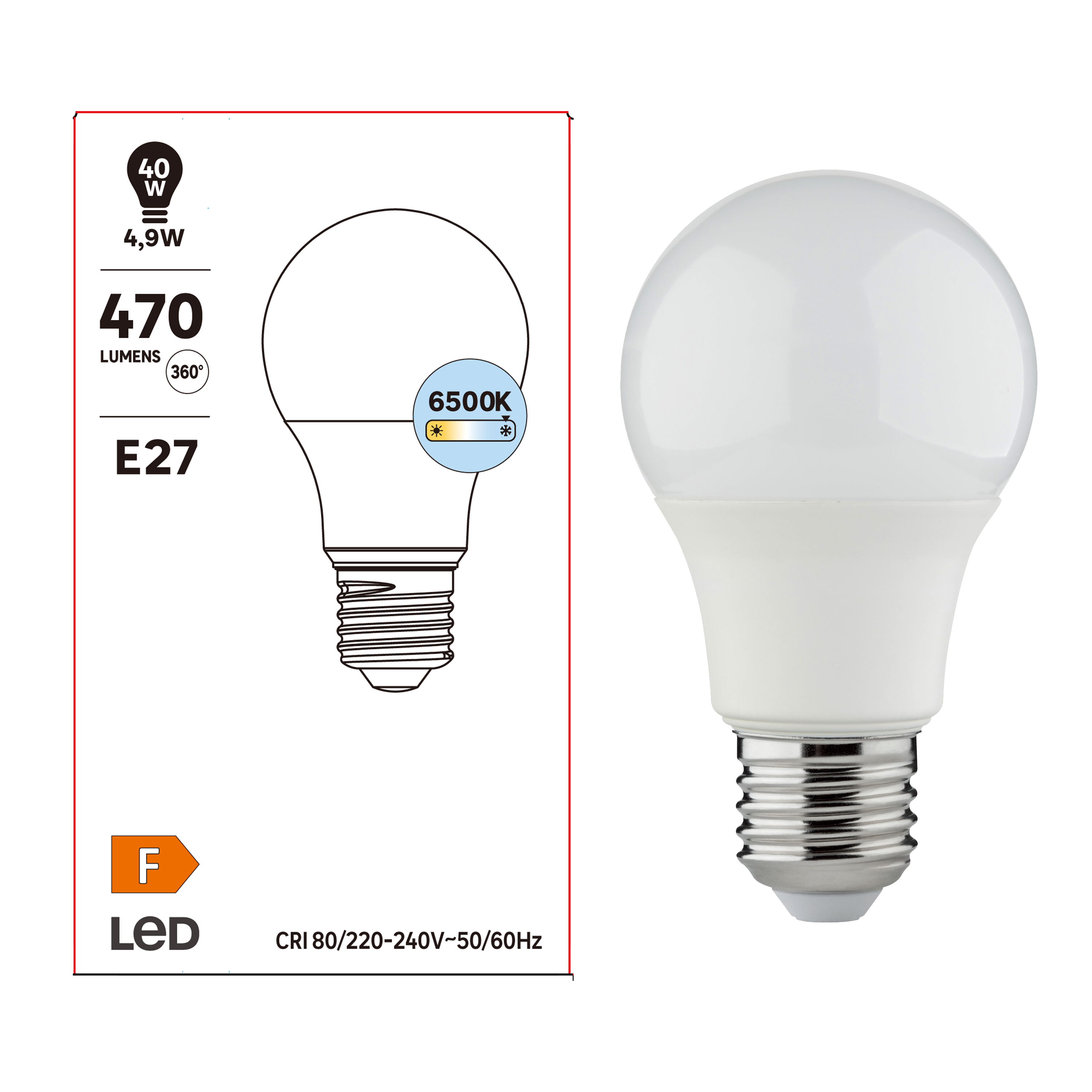 Standardowa żarówka (średnica 60mm) z dużą gwintowaną podstawą (E27). Ta żarówka charakteryzuje się chłodnym białym oddawaniem barw (6500K). Ma moc wyjściową 470 lumenów, co odpowiada 40 watów, ale zużywa tylko 4,9 wata. Produkt ten posiada klasę energetyczną F i jest objęty 3-letnią gwarancją