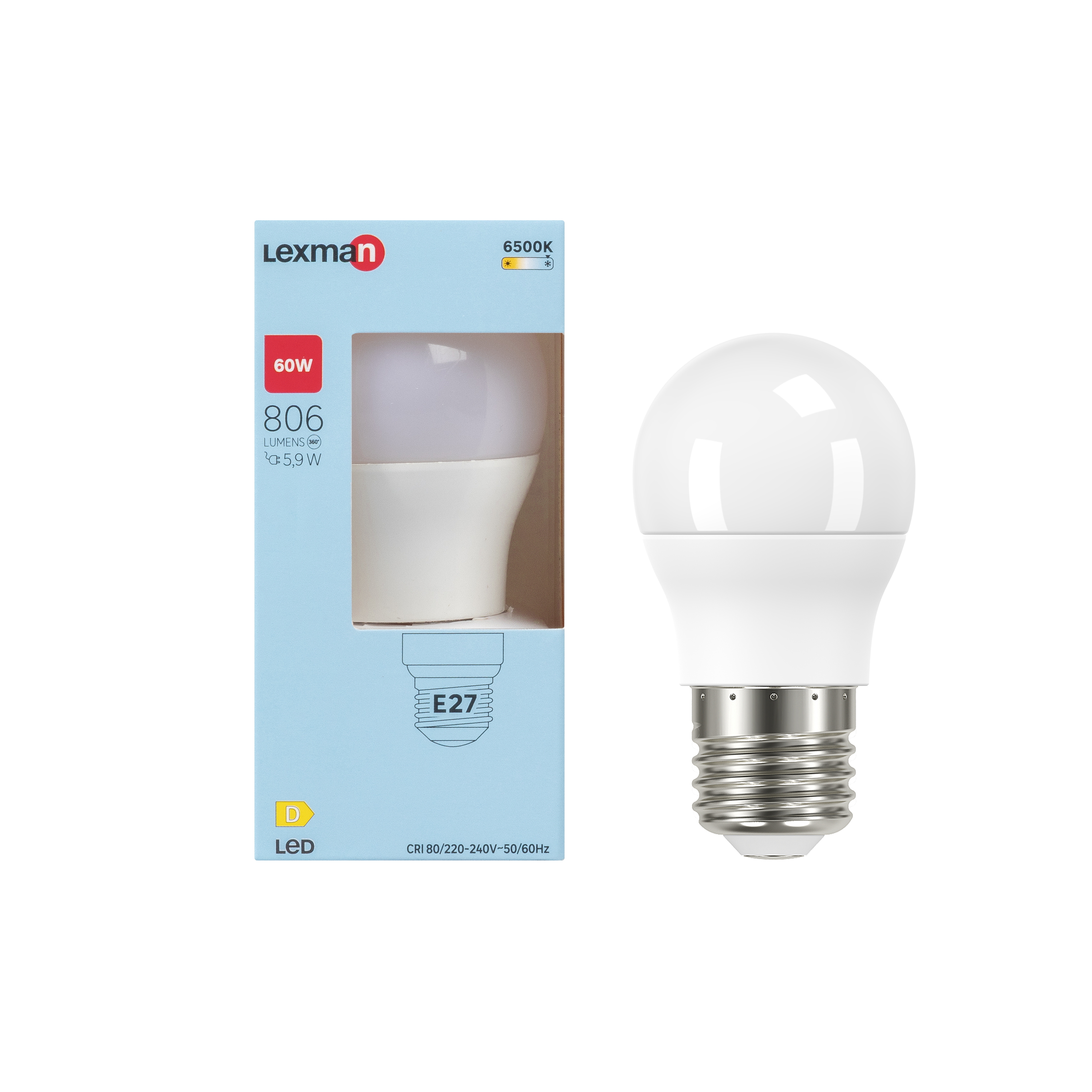 Standardowa żarówka o średnicy 45mm, z dużą podstawą (E27). Ta żarówka z jej temperaturą będzie miała chłodne białe oddawanie barw (6500K). Ta żarówka LED ma moc wyjściową 806 lumenów, co odpowiada 60 watom energii, ale zużywa tylko 5,9 wata. Ten produkt ma klasę energetyczną D i jest objęty 5-letnią gwarancją