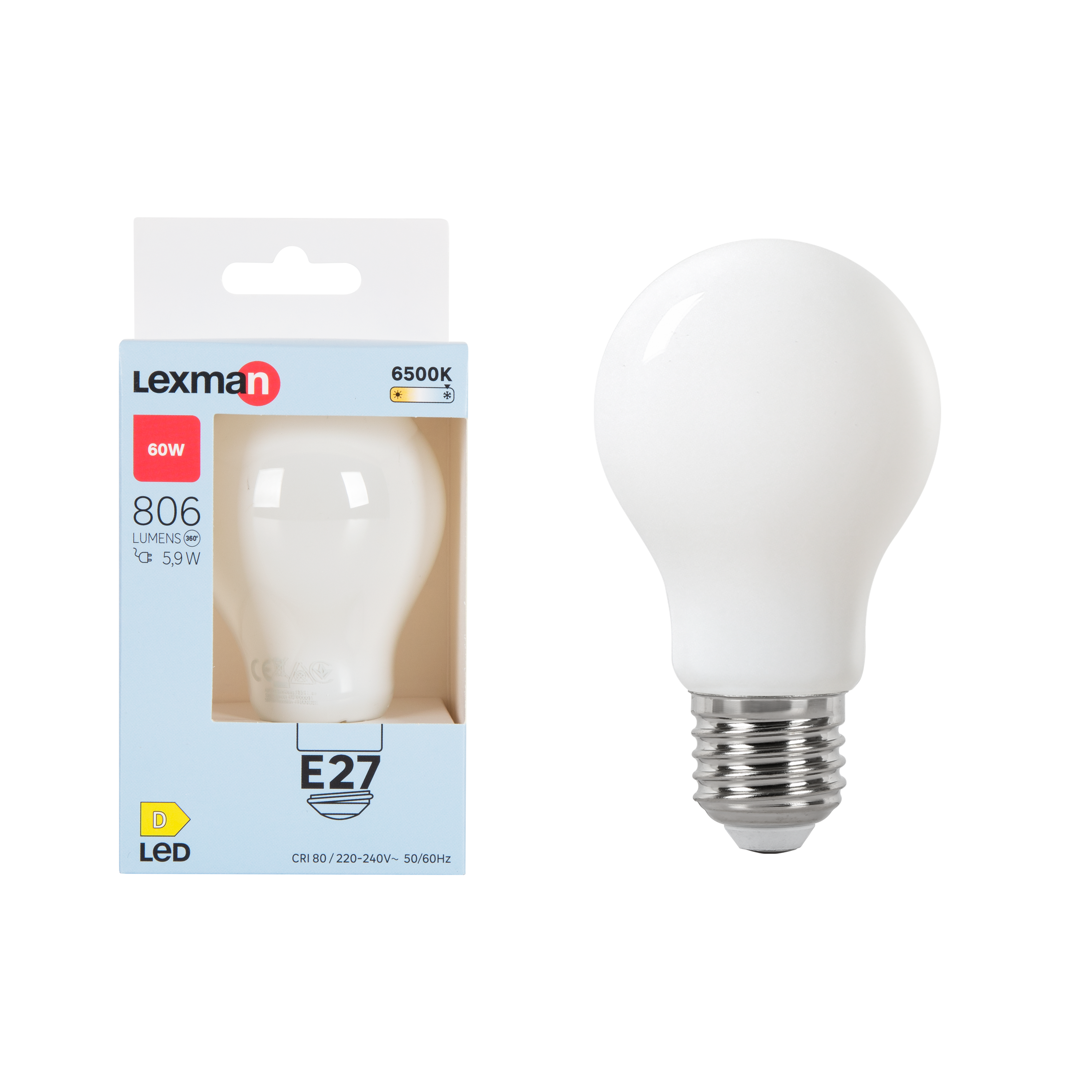Standardowa żarówka mleczna (średnica 60mm) z dużą podstawą (E27). Ta żarówka ma chłodne białe oddawanie barw (6500K) z mocą wyjściową 806 lumenów, co odpowiada 60 watom energii, ale zużywa tylko 5,9 wata. Ten produkt ma klasę energetyczną D i jest objęty 5-letnią gwarancją