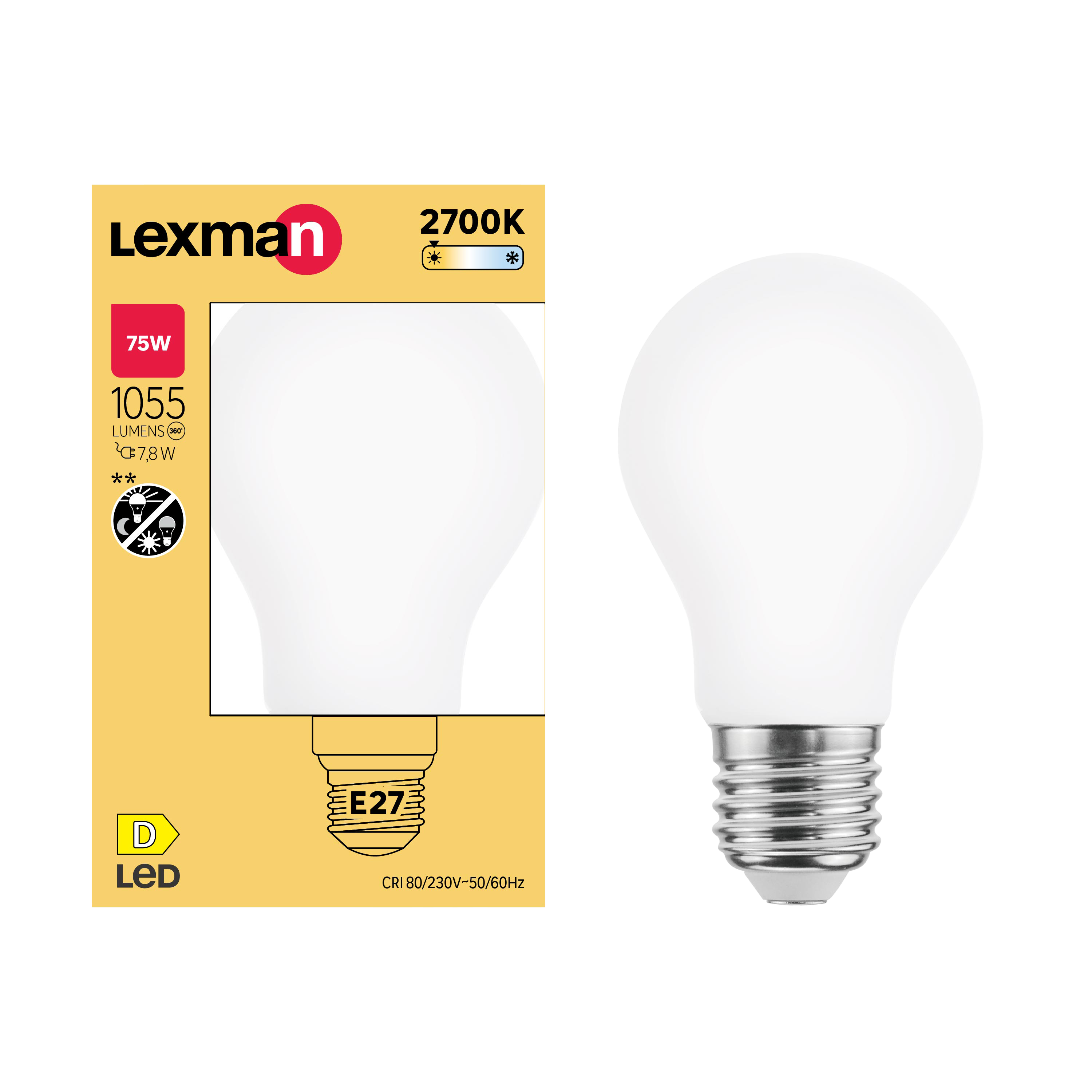 Standardowa żarówka wykrywająca zmierzch (średnica 60 mm) z dużą podstawą (E27). Ta żarówka ma ciepłe białe oddawanie barw (2700K). Ma moc wyjściową 1055 lumenów, co odpowiada 75 watom, ale zużywa tylko 7,8 watów. Ten produkt ma klasę energetyczną D i jest objęty 5-letnią gwarancją