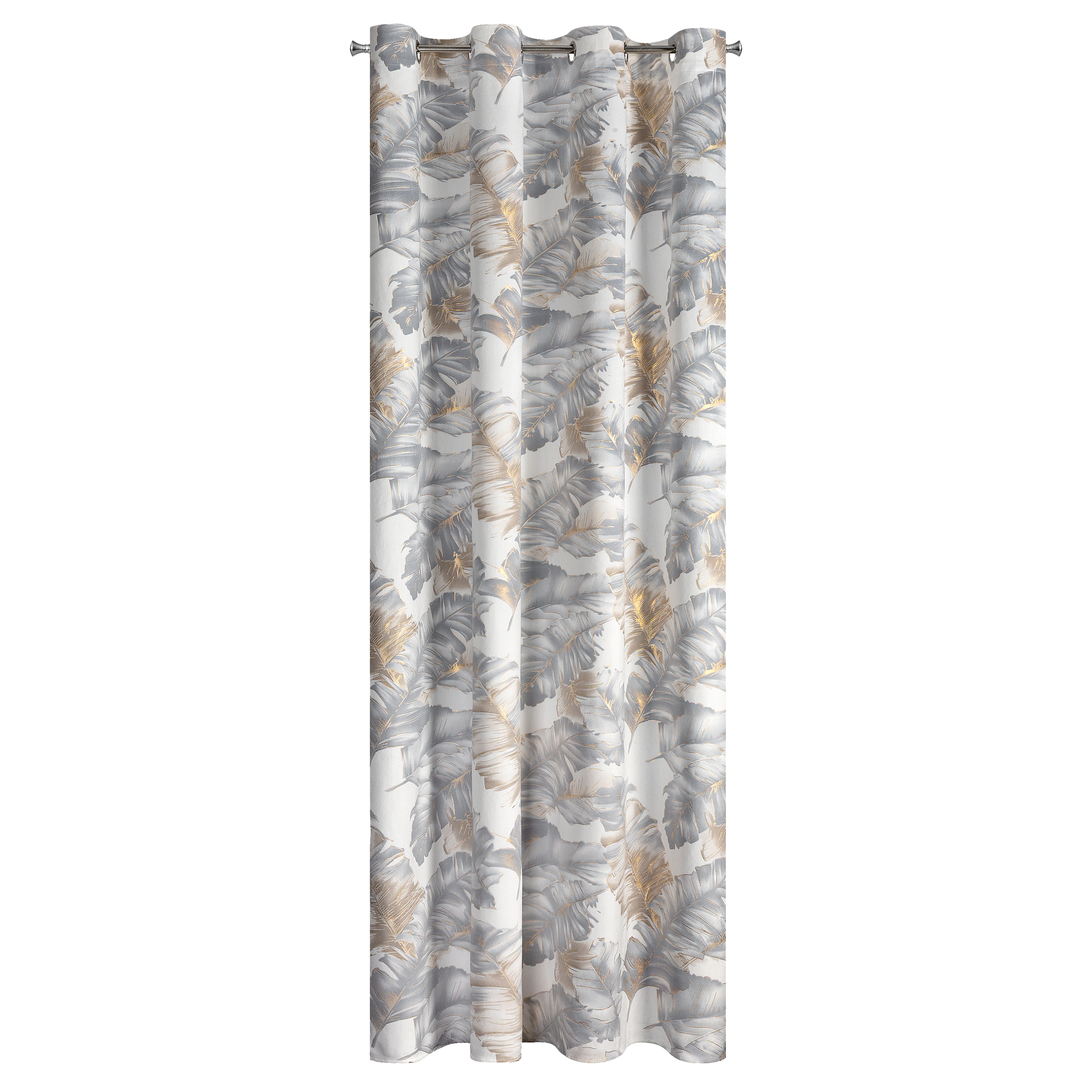 Zasłona gotowa wykonana z miękkiej i delikatnej w dotyku tkaniny welwetowej z błyszczącym nadrukiem liści w kolorze srebrnym i złotym. Grubsza tkanina świetnie izoluje światło słoneczne zapewniając przyjemny klimat we wnętrzu.