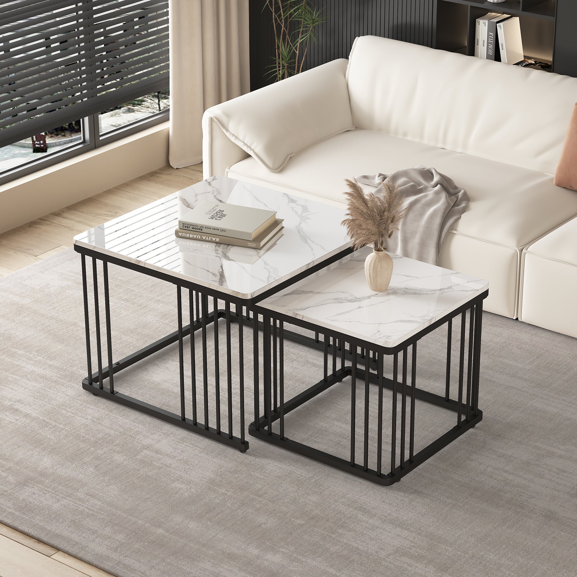 Zestaw 2 kwadratowych stolików kawowych - 60x60x45cm + 45x45x40cm - Wzór marmuru - Płyta MDF, drewno i metal - Biały + czarny