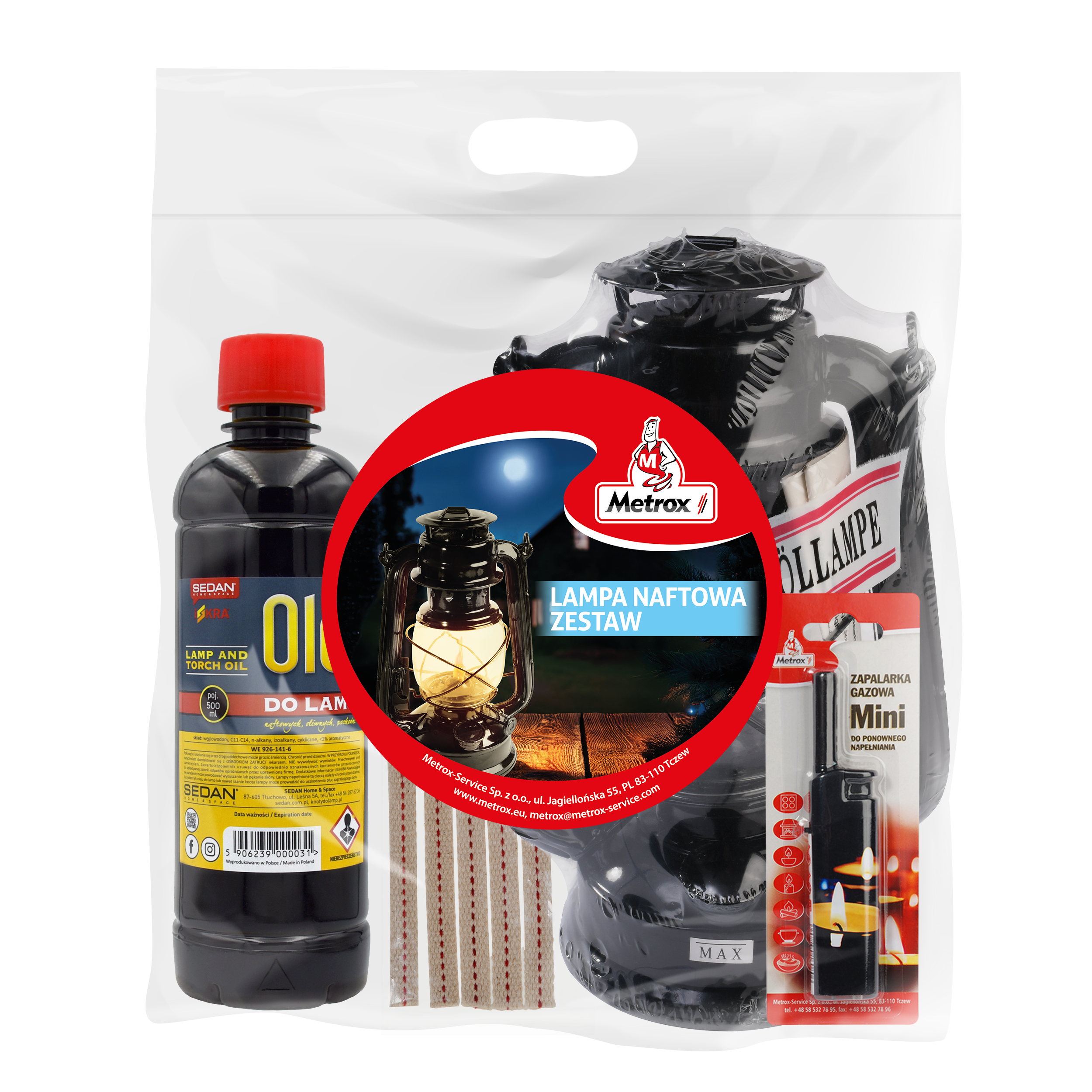 Zestaw lampa naftowa, knoty, zapalarka i olej parafinowy Metrox