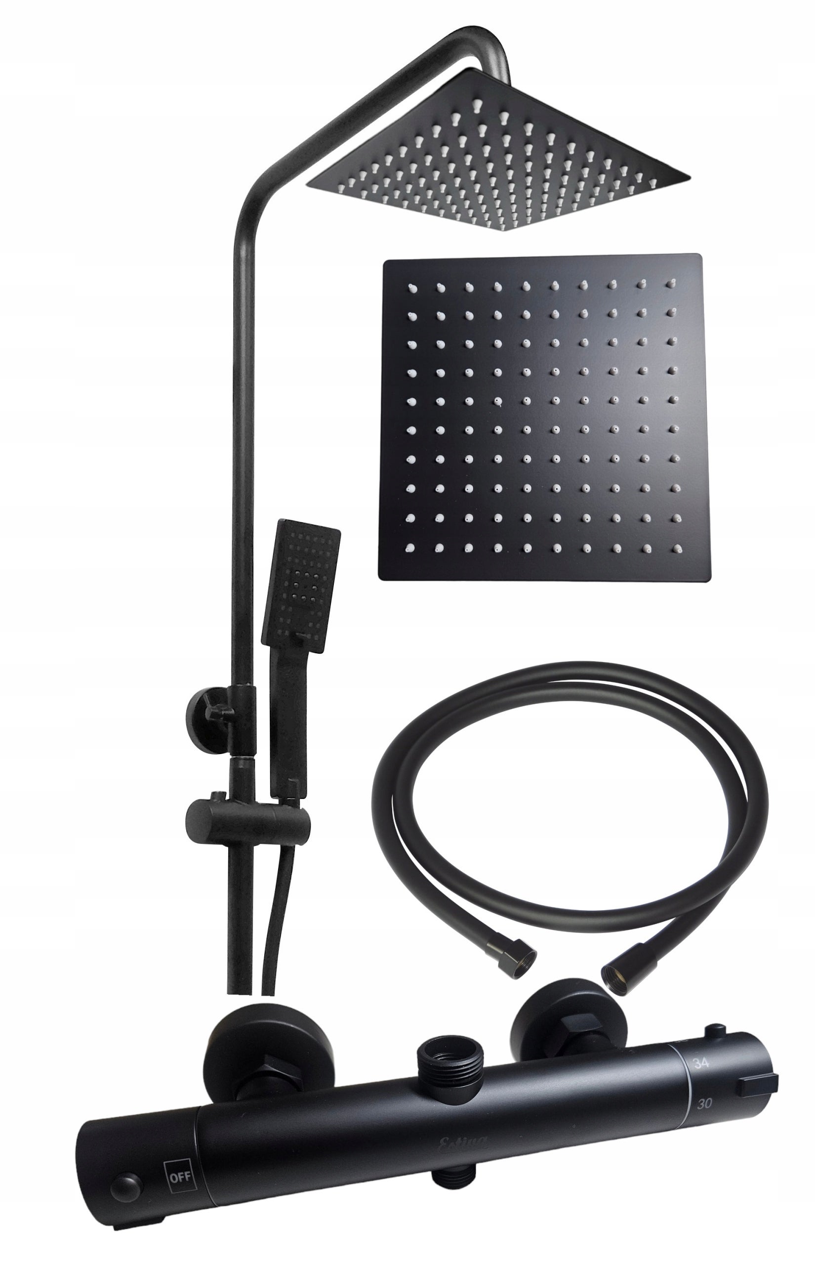 Chcesz wprowadzić nowoczesny design i wygodę do swojej łazienki? Zestaw prysznicowy Estiva ABO Black to idealny wybór. Wyposażony w baterię termostatyczną z zabezpieczeniem przed poparzeniem (38°C) i funkcją przełączania między deszczownicą a słuchawką, zapewnia bezpieczeństwo i komfort użytkowania. Stalowe ramię, kwadratowa deszczownica (20x20 cm) i elastyczny wąż FLEX to trwałe i praktyczne rozwiązania. Przesuwny uchwyt słuchawki umożliwia dopasowanie do użytkownika, a dołączony komplet montażowy ułatwia instalację. Elegancki czarny mat doda stylu każdej łazience. Sprawdź wymiary przed zakupem! UWAGA ! Nie zaleca się montażu baterii termostatycznych do: przypływowych piecyków gazowych, elektrycznych przepływowych podgrzewaczy wody, kotłów dwufunkcyjnych. Pamiętaj, że bateria termostatyczna będzie działać prawidłowo, tylko przy prawidłowo wykonanych przyłączach czyli: ciepła woda po lewej stronie, zimna woda po prawej stronie stojąc twarzą do ściany. Jeśli masz wykonane przyłącza wody odwrotnie czyli nieprawidłowo bateria nie będzie działać.